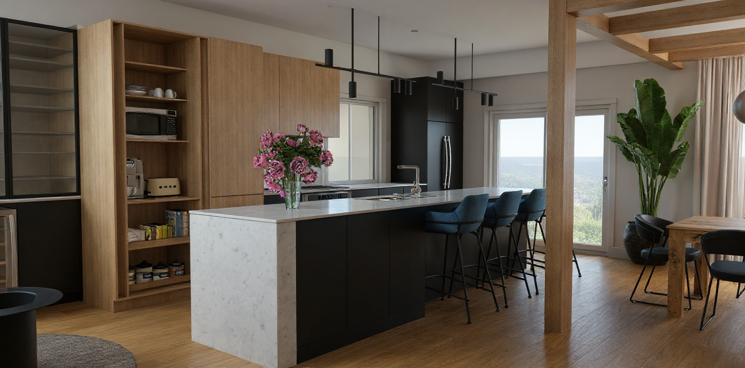 modern house on a hill standing seam roof stone and vertical siding black metal windows curtain wall metal guard rail daytime