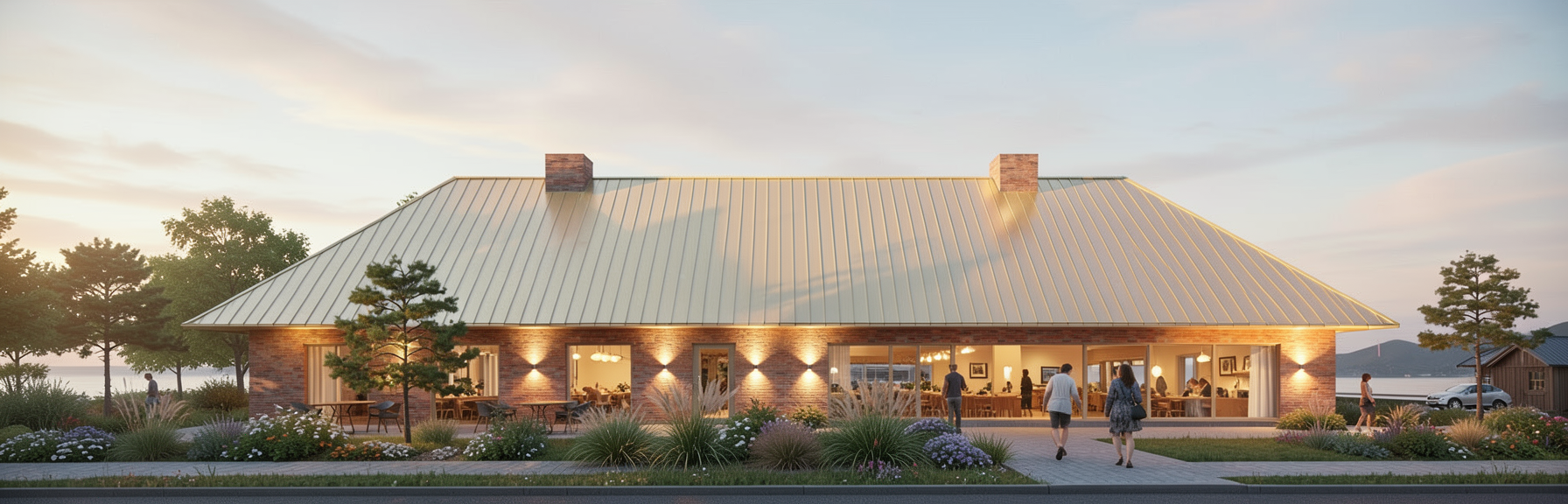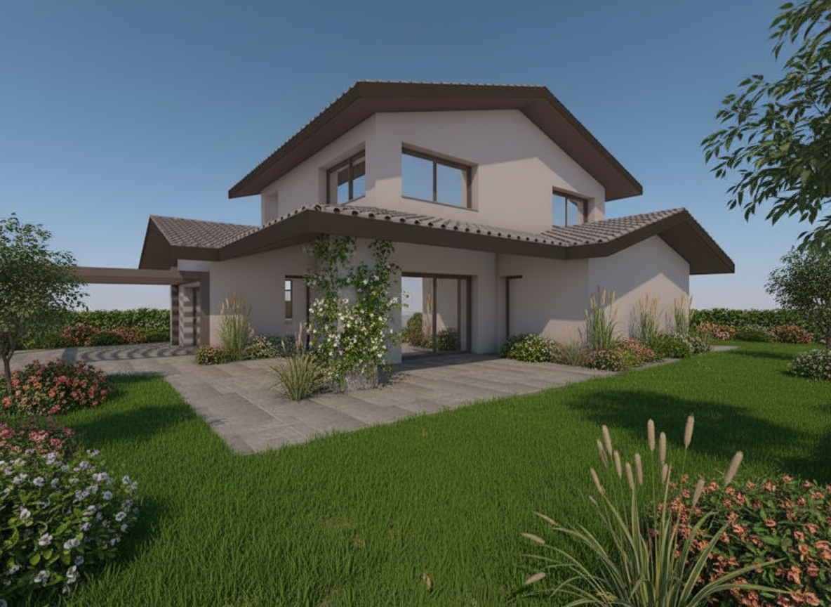 this is a house sith small trees in the background the wall material is black burned wood please make it realistic and leave the landscape as it is the ground is dark brown with lush deciduous plants leave the original structureopenings are in dark black