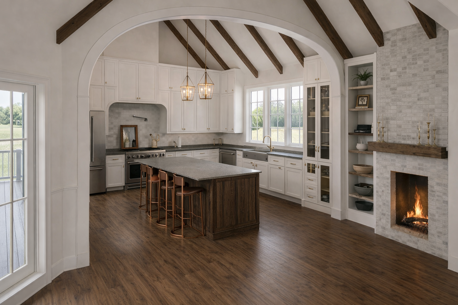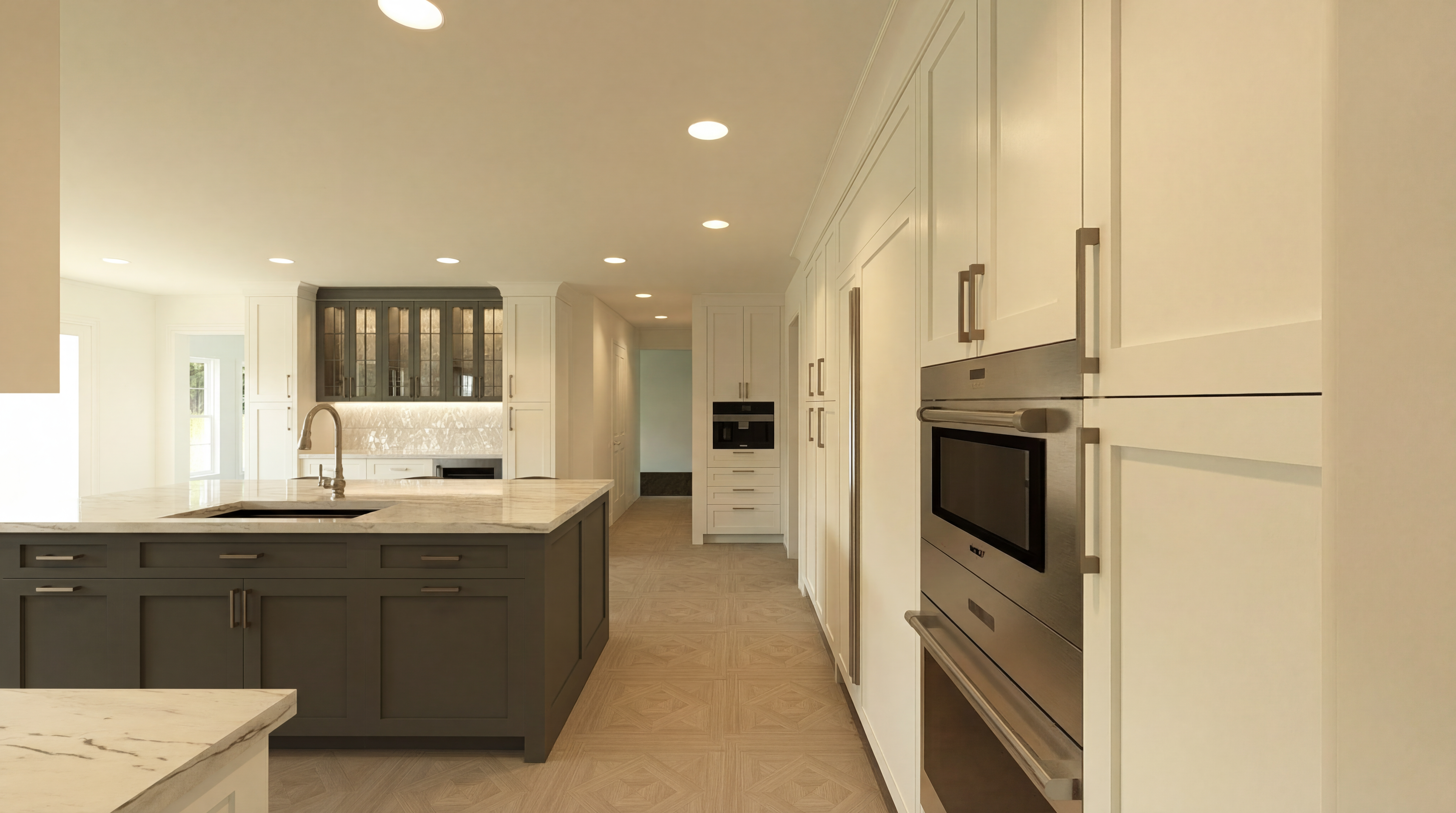 keep everything the same make the island cabinets a light blue color and the countertops a black and white granite the perimeter cabinets are off white