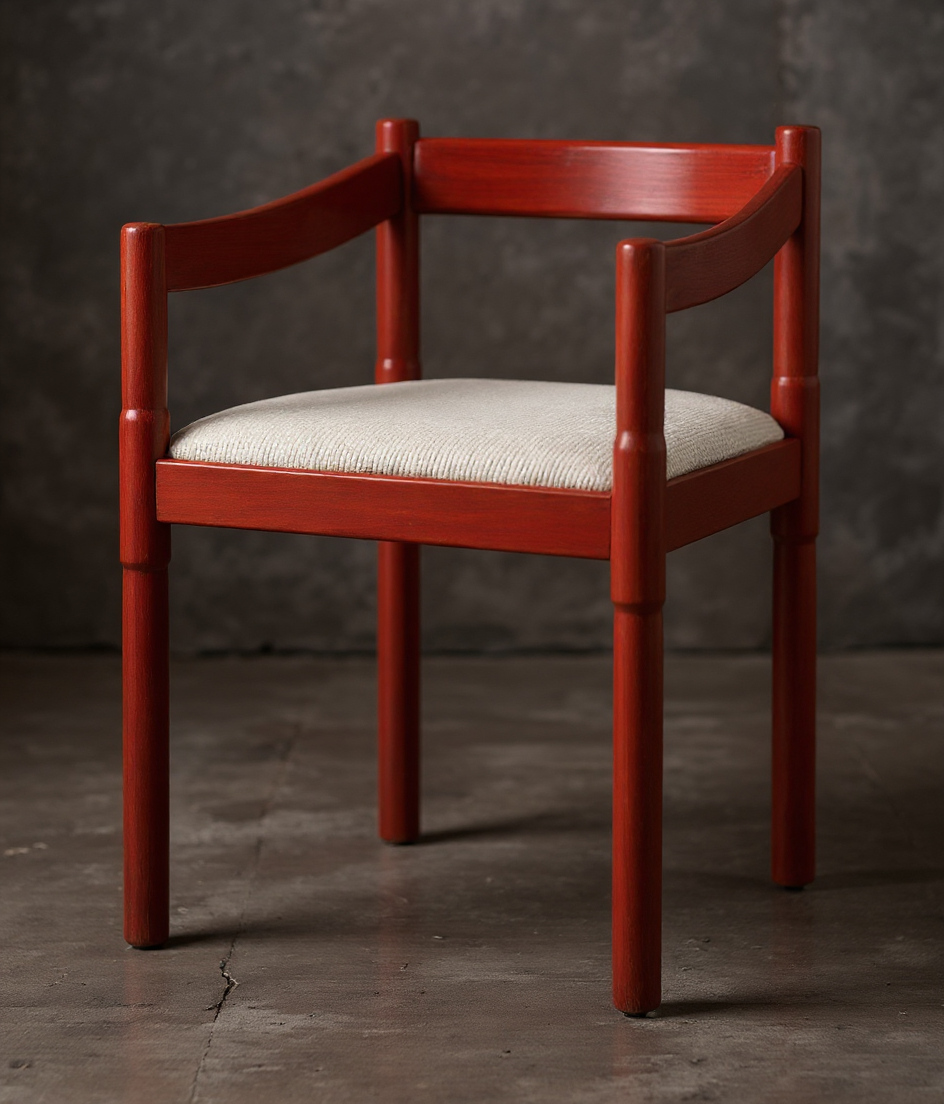 chair with thick dark walnut conical legs seat and back made of thick natural woven rope irregular rustic fiber texture not rattan not wicker rough hand woven rope with visible strands natural beige color photorealistic render warm soft lighting earthy tones
