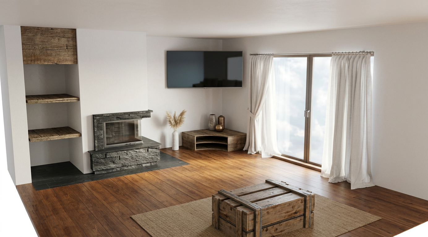 keep the overall atmosphere lighting and composition of the first render with the dark grey upholstered bed preserve the same camera perspective materials colors and layout of the room replace only the upper cabinets above the bed with the cabinetry design shown in the model screenshot use the exact panel layout and proportions from the screenshot the wall niche behind the bed should be finished in natural oak wood veneer matching the nightstands everything else must remain unchanged from the original render the dark grey bed with cinnamon pillows and dark green blanket the oak floor the beige wardrobes the lighting the window curtains rug nightstands sockets and wall lamps only modify the upper cabinets and the back panel behind the bed do not change any other furniture materials colors lighting or camera angle