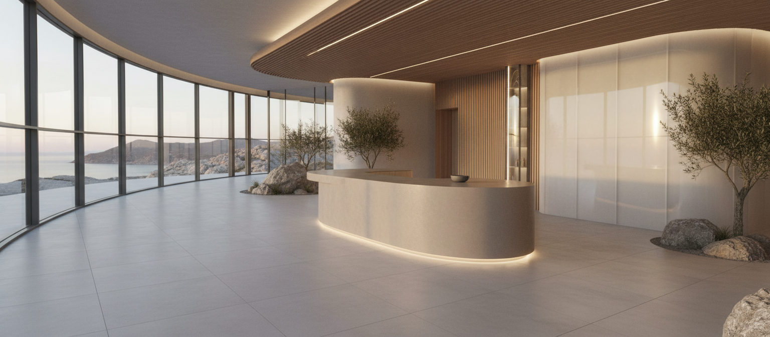 keep the space exactly as it is and definitely keep the reception desk on the right because this space is a summer resort hotel lobby you can first make the reception desk instead of one big one three small ones next to each other putting two or three receptionists and furnish the rest as you wish in the style that contemporary modern summer style five stars hotels love bidets like a living room for many people with lounges and other spectacular decorations with an executive approach