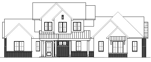 farm house with black metal porch roof light cream batt board siding with grey brick and with black windows and lush landscape in the flowerbeds in front of the house with flowers on a bright sunny day with white puffy clouds architecture
