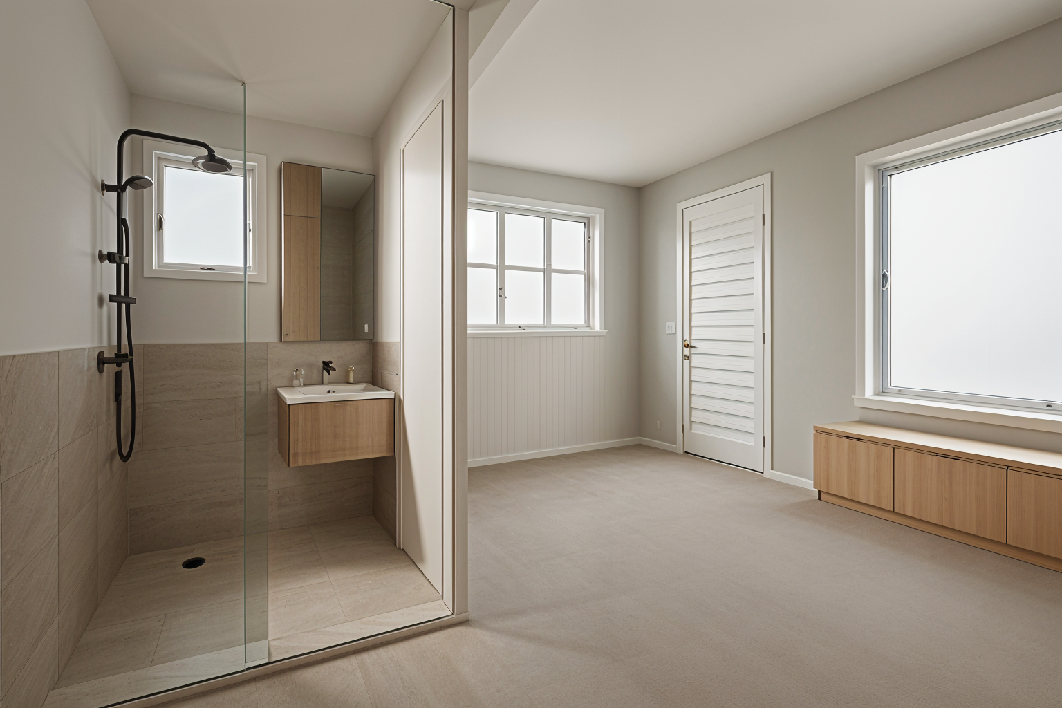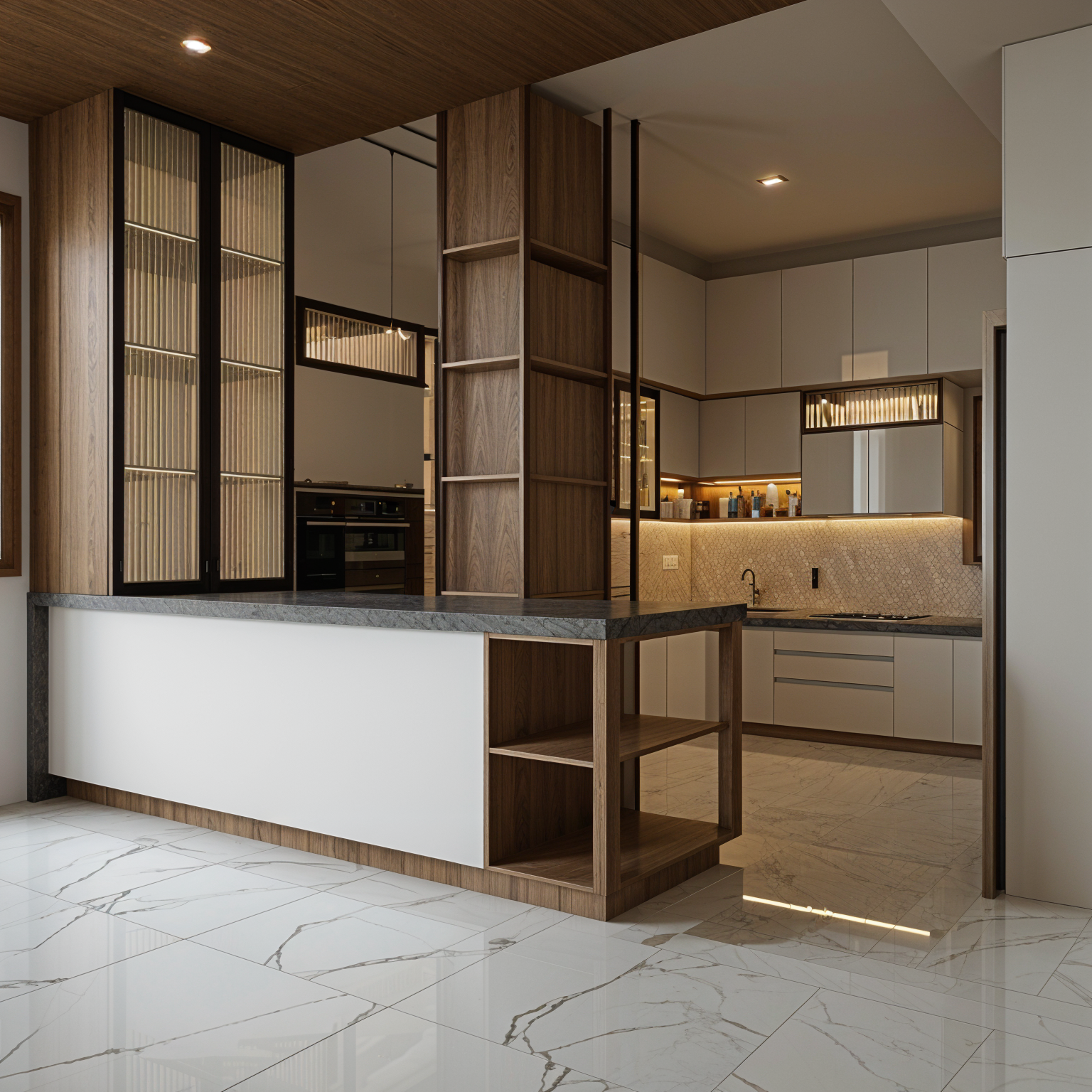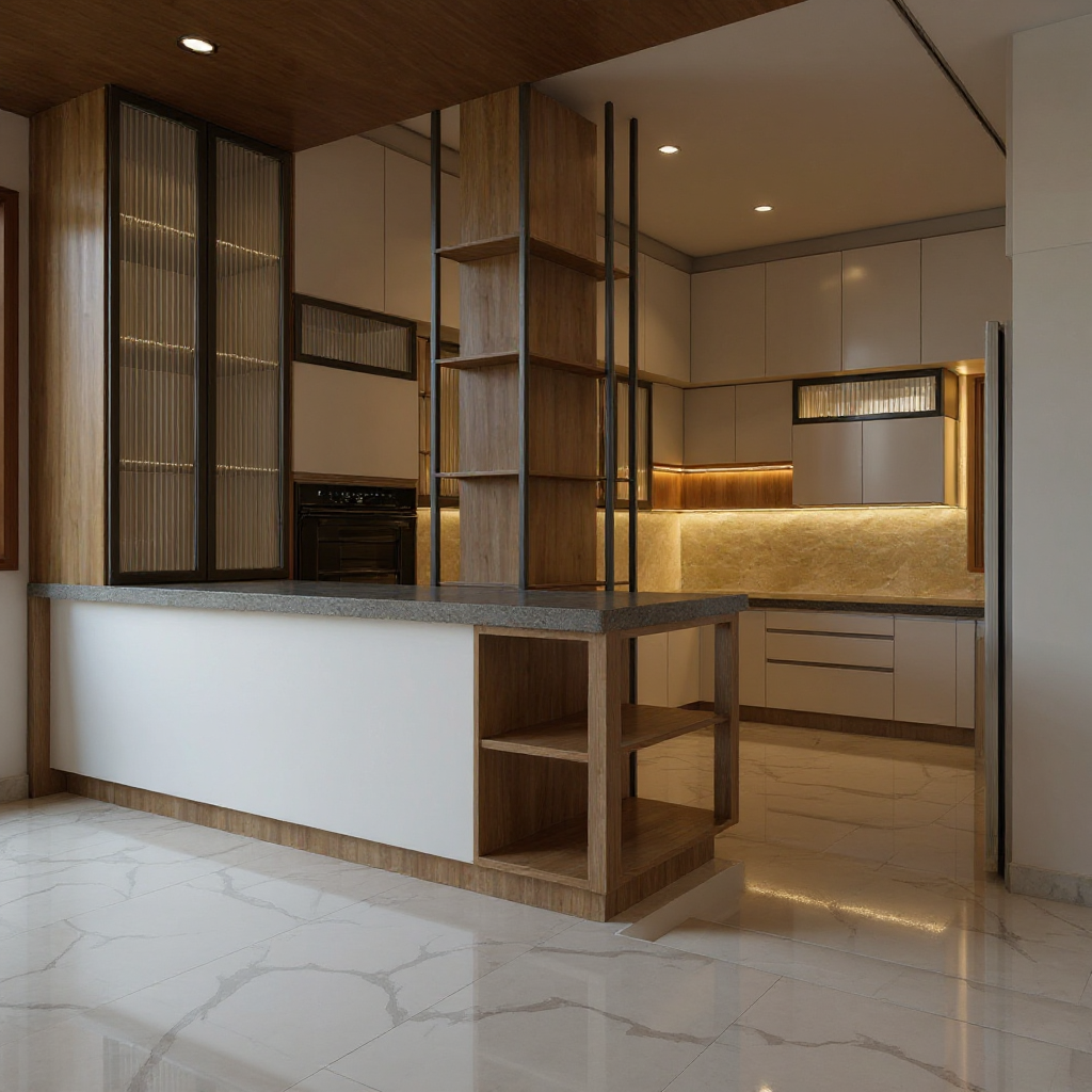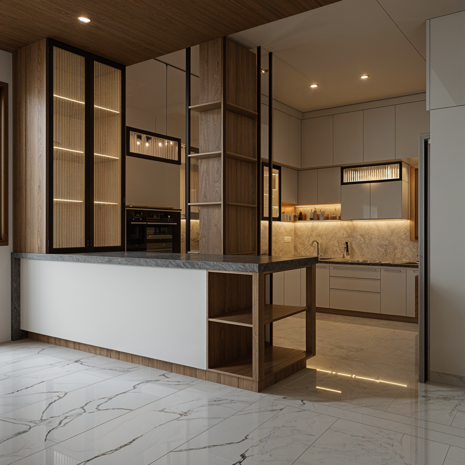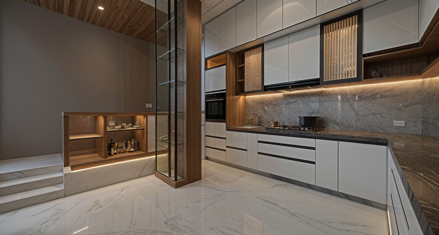generate a high quality realistic render of a kitchen with acrylic glass shutter and under cabinet lights add lights in the skirting