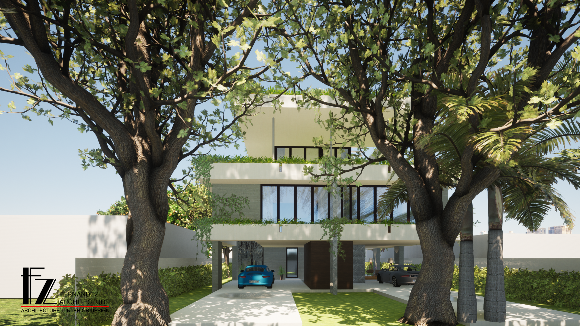 mejora esta imagen para que parezca una foto real la casa es de hormig n con textura de madera en el encofrado los voladizos blancos son de estuco y tiene estas plantas tropicales que caen por las jardineras mira de hacer una imagen hiperrealista