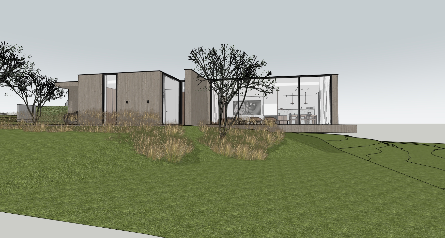 create a photorealistic architectural render from this sketchup model grey wooden panels and crepi black window frames natural grass natural hedge and soft light