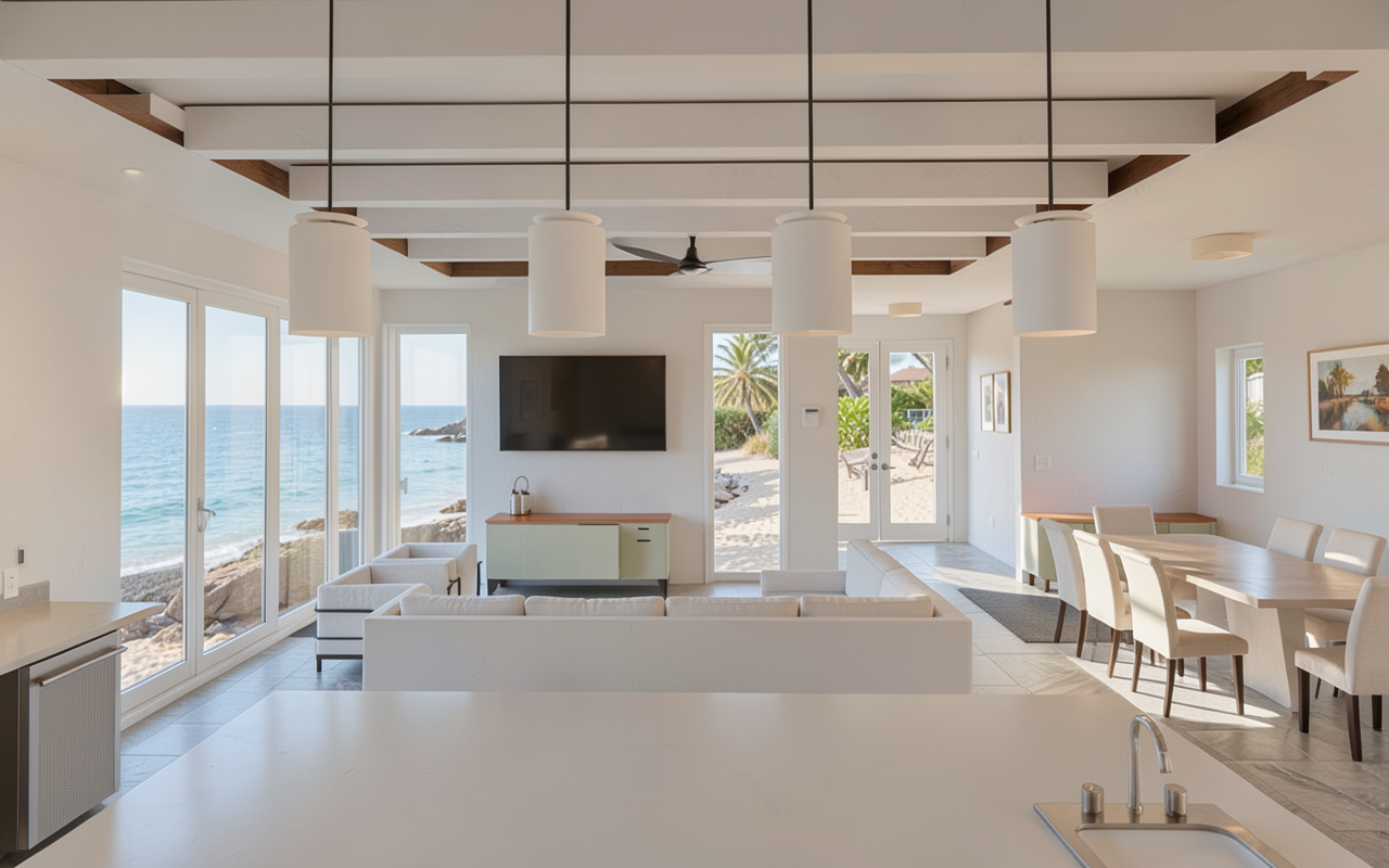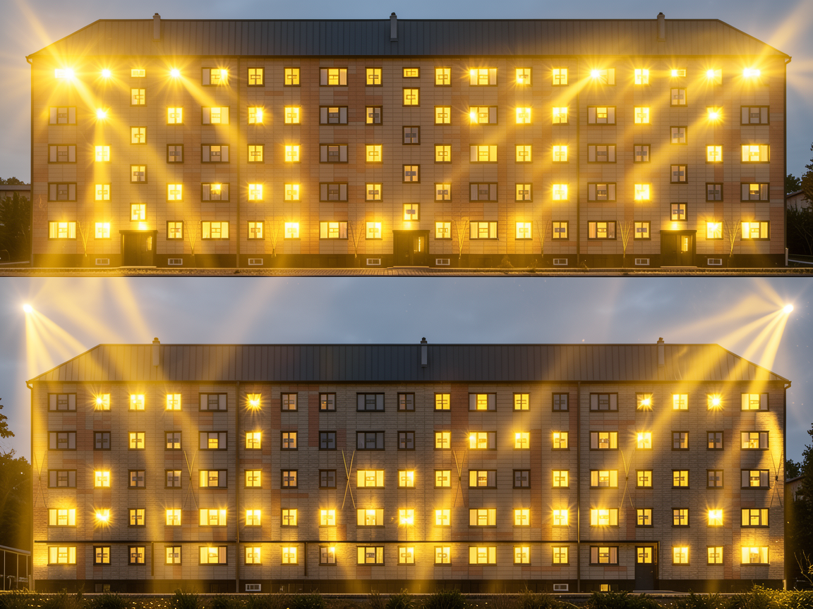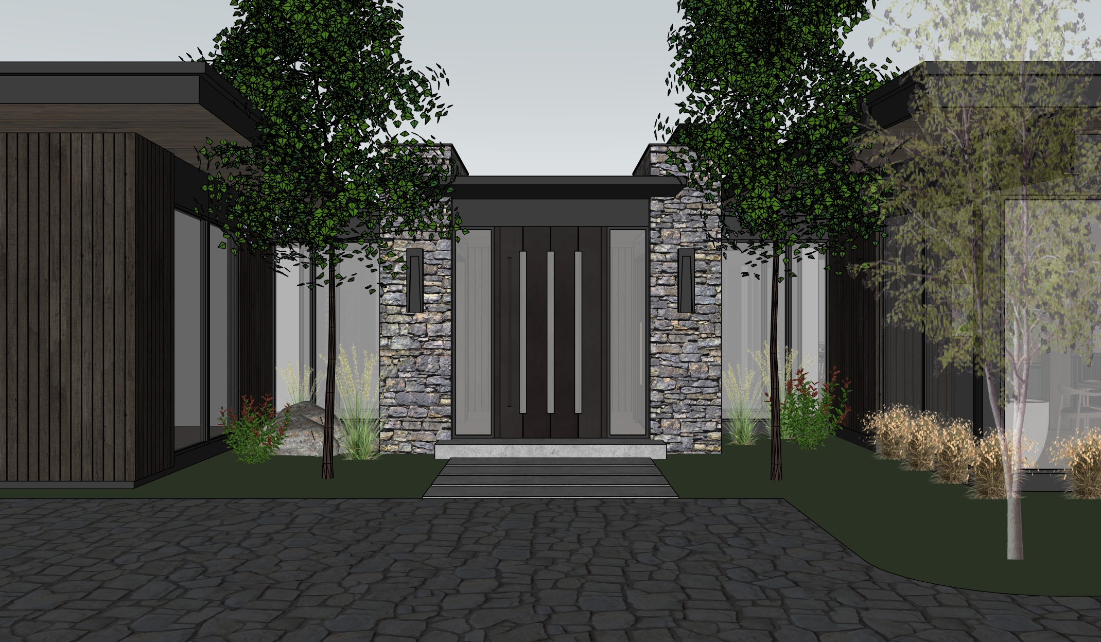 home located in the blue ridge mountains near asheville north carolina rough hewn tennessee fieldstone and stained vertical shiplap siding dark metal accents and window frames plate steel chimney coping to match window frame color flagstone driveway home located in north carolina hardwood forest with dense trees beside home and behind grasses and sparse native plants in foreground no lawn morning light with light fog in trees behind