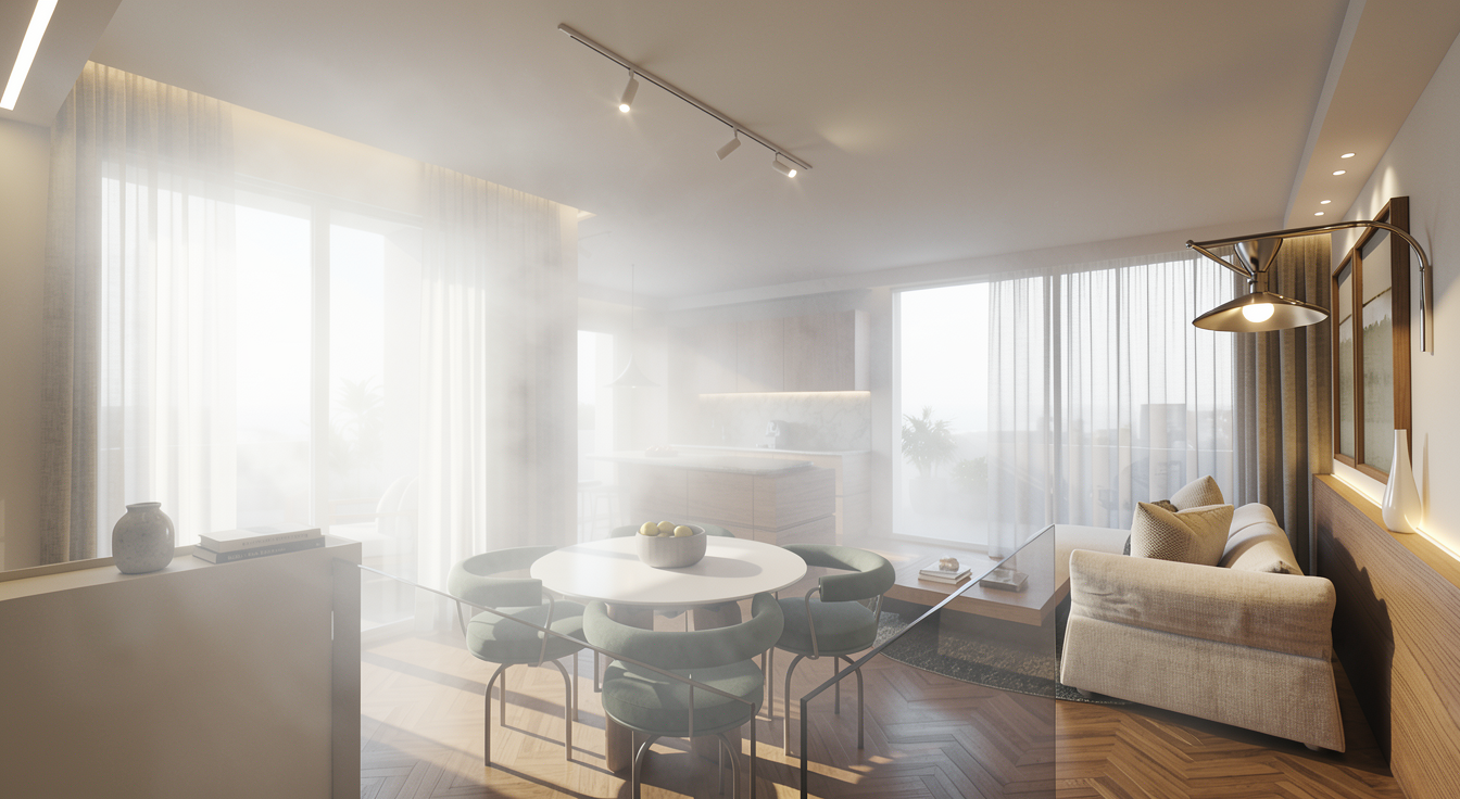 keep everything exactly the same in the rendering do not change the layout walls doors windows shower niche plumbing fixtures wall tile lighting vanity or any materials only change the floor tile size have it match the size on the of the wall tiles so make the floor tiles wider not longer even wider then a 16x48 do not change the tile material color layout keep everything else exactly the same make the final image look like a realistic photo rendering with natural lighting and soft shadows