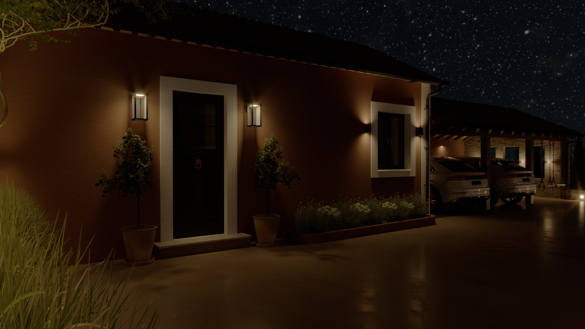 render a serene nighttime scene of a quaint rustic house with a warm atmosphere the house facade has a rich terracotta color with white trim around doors and windows two elegant outdoor wall lights cast a gentle golden glow on the entrance illuminating the doorway and casting soft shadows there are two potted bushes at the entrance and a lush border of greenery next to the house a carport shelters two sleek modern cars the sky is a deep indigo scattered with sparkling stars creating a peaceful dreamy ambiance the ground is a smooth muted beige reflecting the ambient light subtly