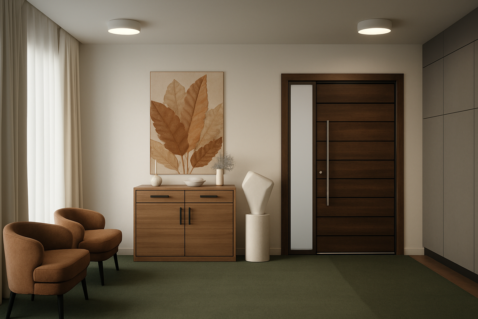create ultra realistic images without changing any structure shape design or materials do not resize jpegs beige wood vinyl flooring plain off white walls beige wall panels add indirect light add terace view in the left windows add lobby dental clinic view in the right window seamless window and the ceiling color is beige