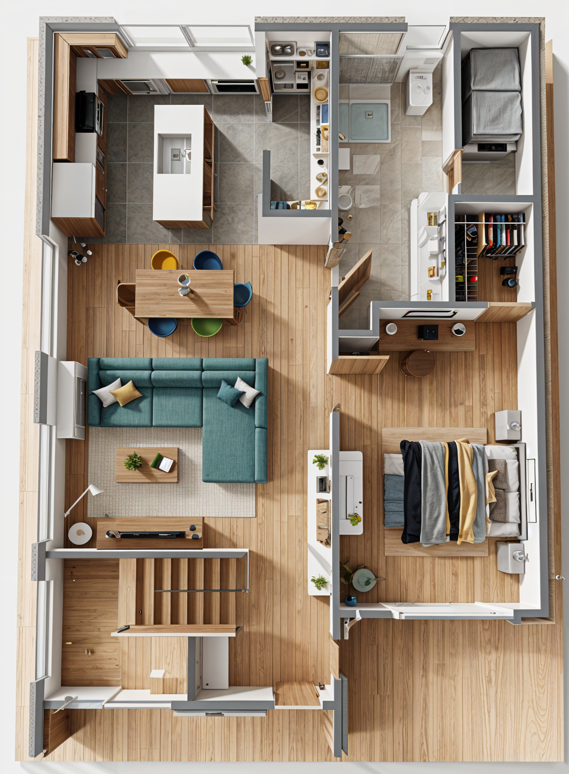 realistic photographic interior rendering in natural daylight use the provided sketchup base image as the structural reference preserve every single architectural element exactly as positioned all cabinetry layout open shelving island proportions wall oven gas range refrigerator sink faucet interior doors ceiling flooring and all structural walls remain completely unchanged do not add remove or reposition anything except what is explicitly stated below atmosphere light warm natural daylight filling the space softly gentle ambient shadows the existing wall sconce fixtures remain exactly as positioned champagne brushed bronze finish warm and aged not shiny brass not chrome no pendant lighting added anywhere cabinetry painted cabinets every painted cabinet the tall cabinet tower on the left wall the upper cabinets flanking the hood and any other painted section shown renders in a warm taupe cream the tone is a creamy off white with a soft warm beige undertone not stark white not bright not grey not yellow think a muted warm putty or aged parchment sophisticated quiet and intentional shaker style door and drawer profiles exactly as shown on every painted cabinet cabinetry wood cabinets every wood cabinet renders as a warm neutral smoked oak with a taupe undertone a medium depth oak that reads balanced neither too cool nor too warm the base tone is a refined taupe brown with visible straight grain running vertically the grain is bold and pronounced but the overall color stays calm and neutral think aged european smoked oak at a perfect middle tone not golden not blonde not grey not dark walnut matte to satin finish no gloss this tone applies to every wood cabinet every wood drawer front and every open wood shelf in the image hood the hood renders in the same warm taupe cream painted finish as the painted cabinets the body matches the painted cabinetry exactly the hood s trim detailing and any framing accents render in the same warm neutral smoked taupe oak as the wood cabinets this gives the hood a two tone architectural quality that ties the painted and wood cabinetry together critical no added glass anywhere the only cabinets with glass inserts are the small upper cabinets already showing glass in the base rendering every other cabinet all painted taupe cream cabinets all lower wood cabinets all drawer fronts has solid opaque shaker doors or drawer fronts with no glass of any kind do not add glass to any cabinet that does not already show glass in the base image hardware every single pull and knob throughout the entire kitchen is champagne brushed bronze warm aged slightly darkened gold bronze tone not yellow brass not polished gold not chrome not black present on every cabinet door and every drawer front throughout the entire kitchen countertops island backsplash all these surfaces are the same continuous stone a warm creamy beige quartzite in the spirit of taj mahal quartzite the base color is a warm sand cream with a soft blush ivory undertone not white not grey veining is soft flowing and cloudlike diffused taupe and warm golden grey movement blending into the background rather than sitting boldly on top subtle organic and luminous this stone wraps the full perimeter countertop the island top and waterfall edge and the full height backsplash behind the range polished finish with a quiet warm sheen sink stays exactly as shown same material same color same finish as in the base rendering appliances stainless wall oven exactly as shown gas range exactly as shown refrigerator panel ready or stainless exactly as shown no changes open shelving left wall renders in the same warm neutral smoked taupe oak as the wood cabinets styled with one small trailing green plant in a simple matte ceramic pot a tight stack of two linen covered hardcover cookbooks lying flat and one minimal matte ceramic vessel clean and intentional nothing else glass cabinet interiors only where already shown in base neatly stacked white ceramic plates simple glassware and one small minimal ceramic object visible through the glass island styling one medium leafy green plant in a minimal stone or ceramic pot one ceramic fruit bowl with mixed seasonal fruit two hardcover books stacked flat with a small object resting on top nothing else on the island surface flooring light natural wood plank flooring exactly as shown warm pale tone straight planks unchanged do not add glass to any cabinet not already shown with glass do not add pendant lighting do not add rugs furniture or any architectural elements beyond what is shown