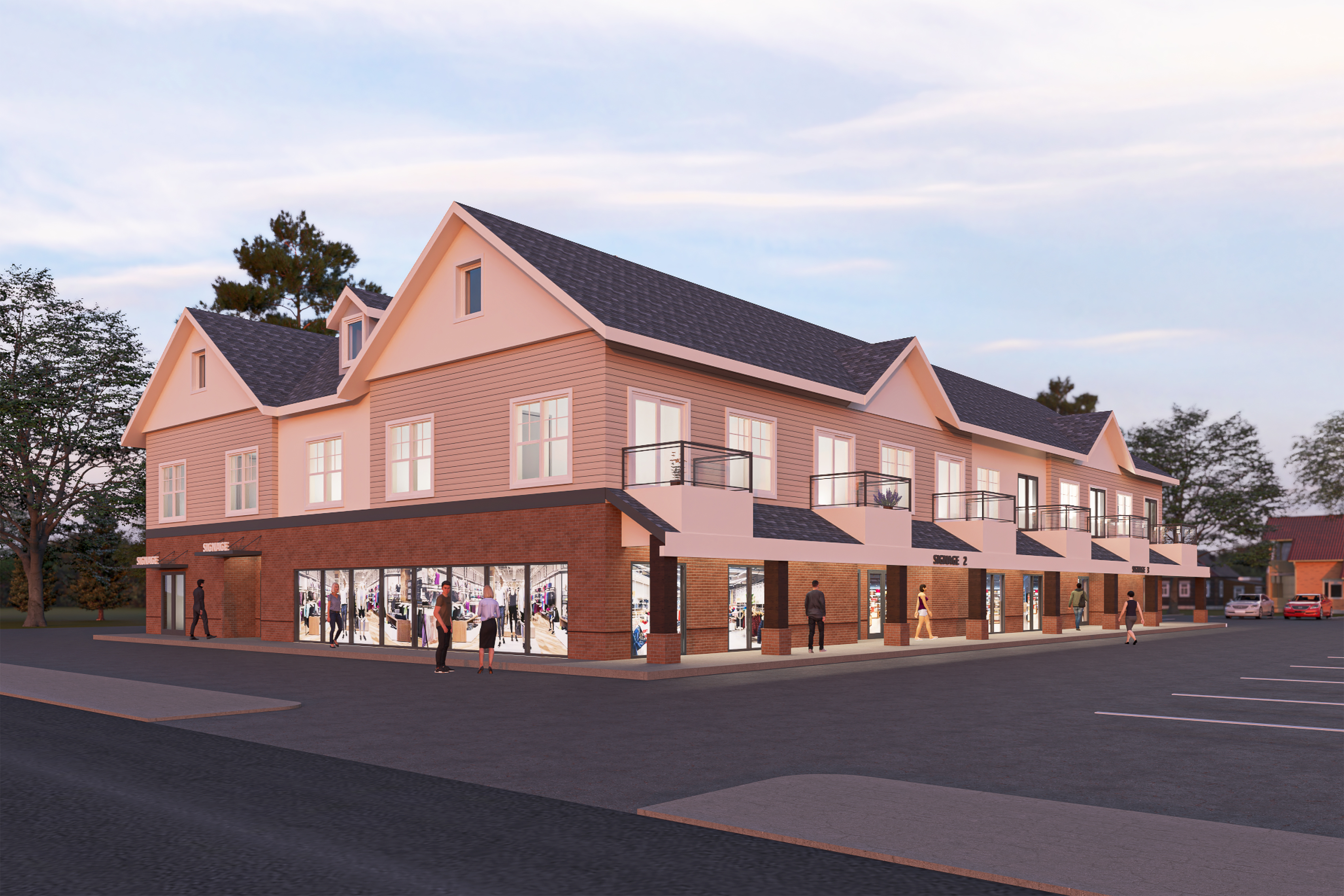 create a photo realistic image for this building keeping colors shapes and texture enhance the quality and create a fall version with people cars lights coming from inside the unis