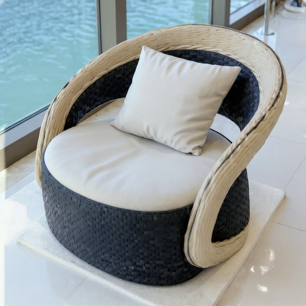 modernist exterior shot white upholstered seat rattan poles inspired chair wooden finish architecture