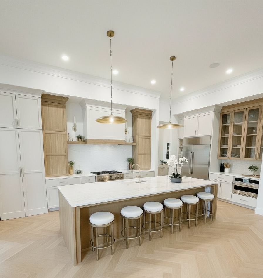 change all cabinets and range hood to sw caviar paint color leave the island european white oak wood