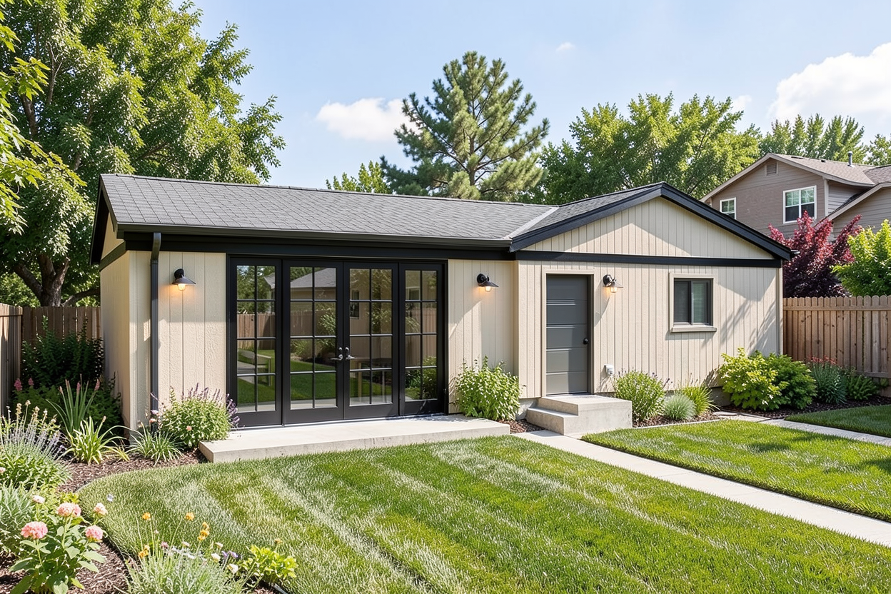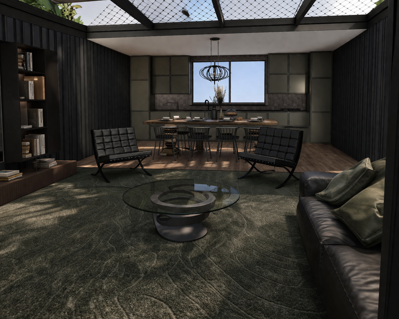 the couch is black leather the rug is green and has a nice texture the walls on both side are container and the kitchen is olive cold green