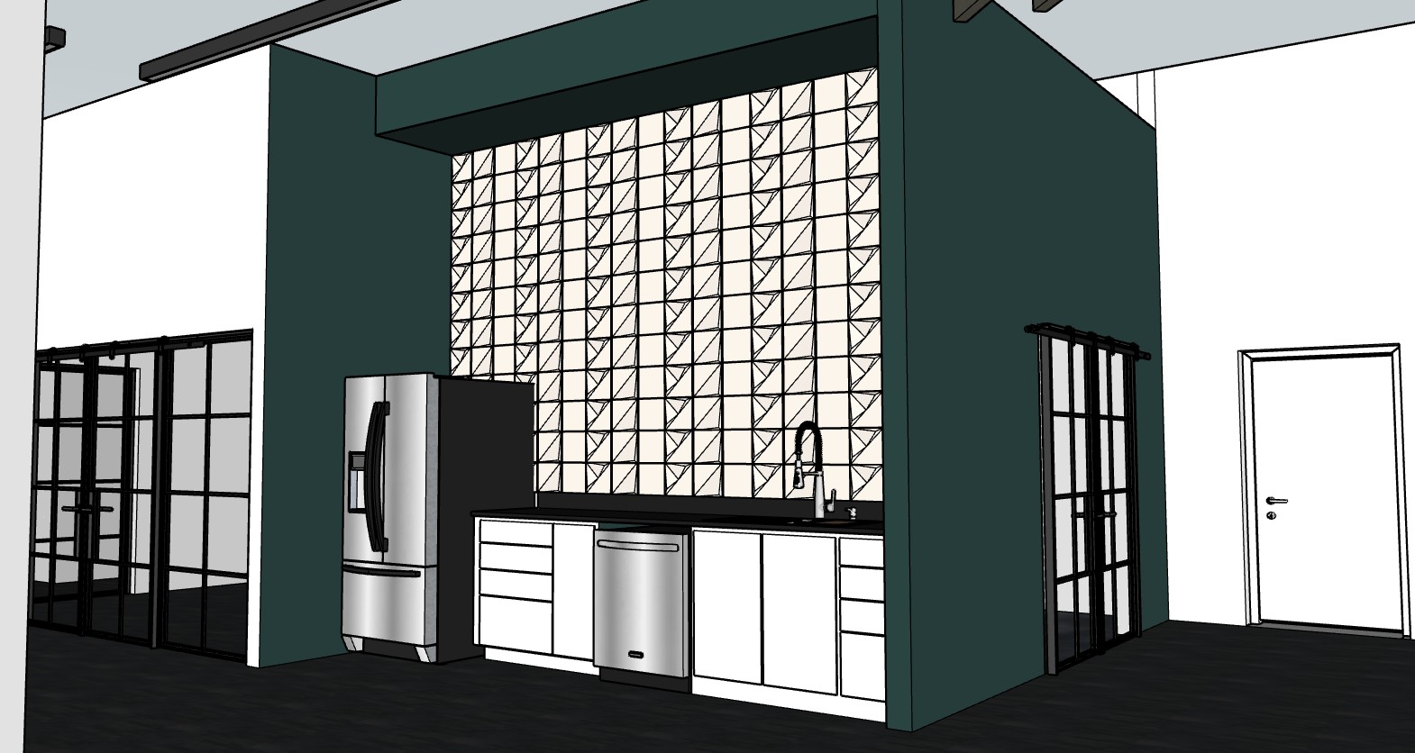 modern corporate office breakroom interior preserve exact layout and architecture no changes to walls or openings deep desaturated teal walls with blue undertones not green black metal framed doors and fixtures stainless steel appliances white cabinetry geometric tile backsplash as shown strictly interior scene no outdoor elements soft warm 3000k recessed lighting subtle under cabinet lighting realistic high end professional office design