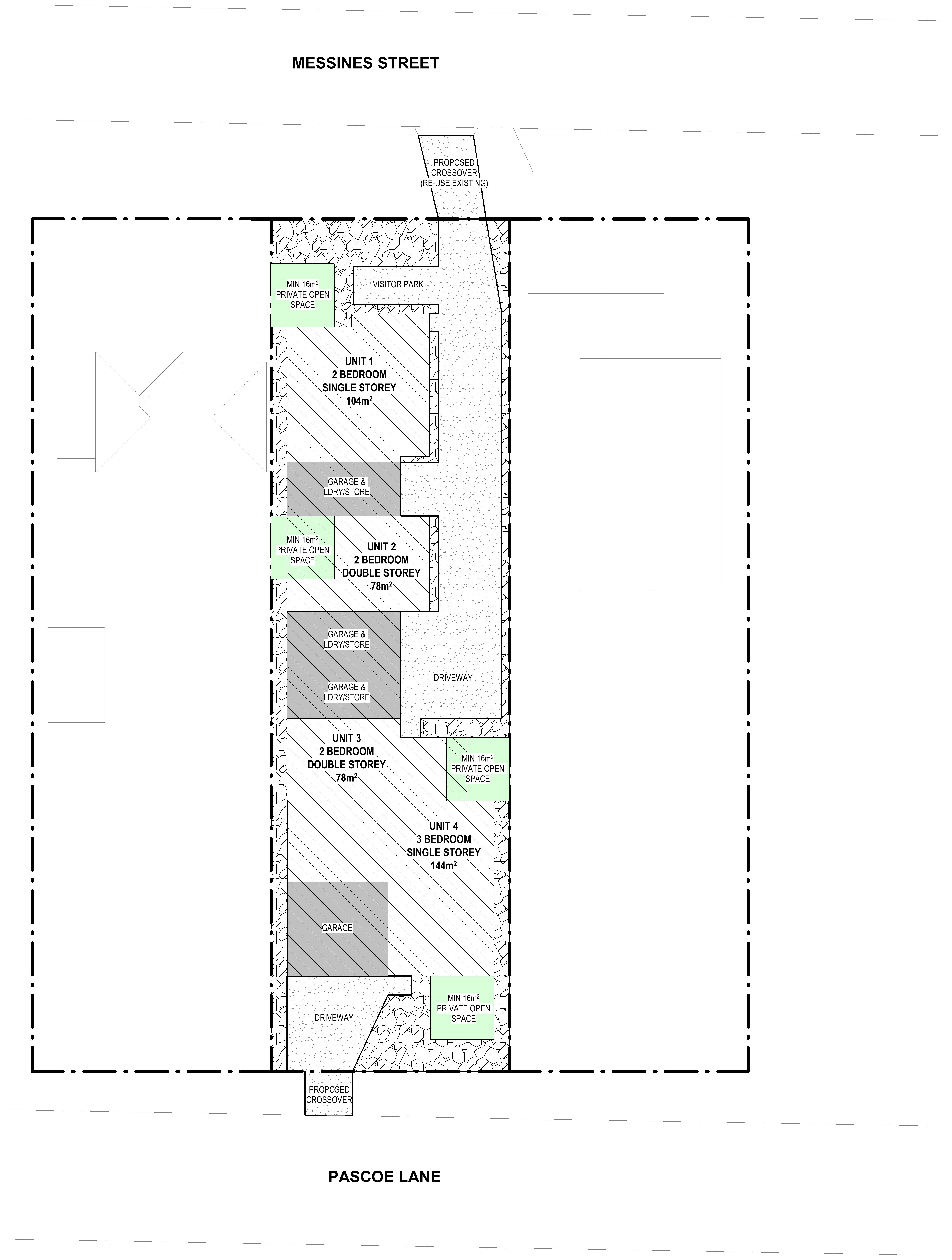 professional architectural site plan render strict top down 2d view maintain exact site boundaries dimensions building footprints driveway alignment and crossover locations unchanged replace all pebble hatch areas only with high quality landscaping including green lawn defined garden beds low maintenance shrubs and a small number of well spaced feature trees trees should be appropriately scaled for a residential development small to medium canopy not oversized add landscaping specifically along both side boundaries as soft planting buffers around private open space areas to enhance usability near visitor parking to soften hard surfaces along driveway edges without obstructing vehicle access keep driveway and vehicle circulation areas clear and fully readable do not place trees or plants within drive paths or on the green hatch zones use realistic but subtle materials light grey concrete for driveway muted green lawn natural garden bed tones and soft organic planting shapes apply clean professional developer style graphics with no shadows under trees and slight texture variation ensure the drawing remains crisp legible and suitable for client presentation do not change building shapes sizes or positions do not move or alter driveways crossovers or parking layout do not add extra structures no perspective or 3d angles no people cars or furniture do not blur or modify text do not overscale trees or overcrowd planting avoid dense forest like landscaping