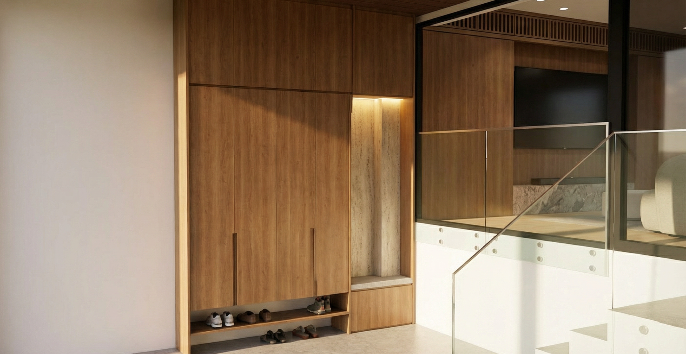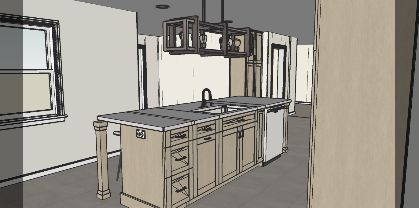 white subway tile backsplash white quartz countertops blonde maple cabinets antique hardware on cabinets aged brass faucet plaster colored luxury vinyl tile in 12x24 in a brick pattern on the floor snowbound by sherwin williams on the walls the chandelier over the island is a bronze black color