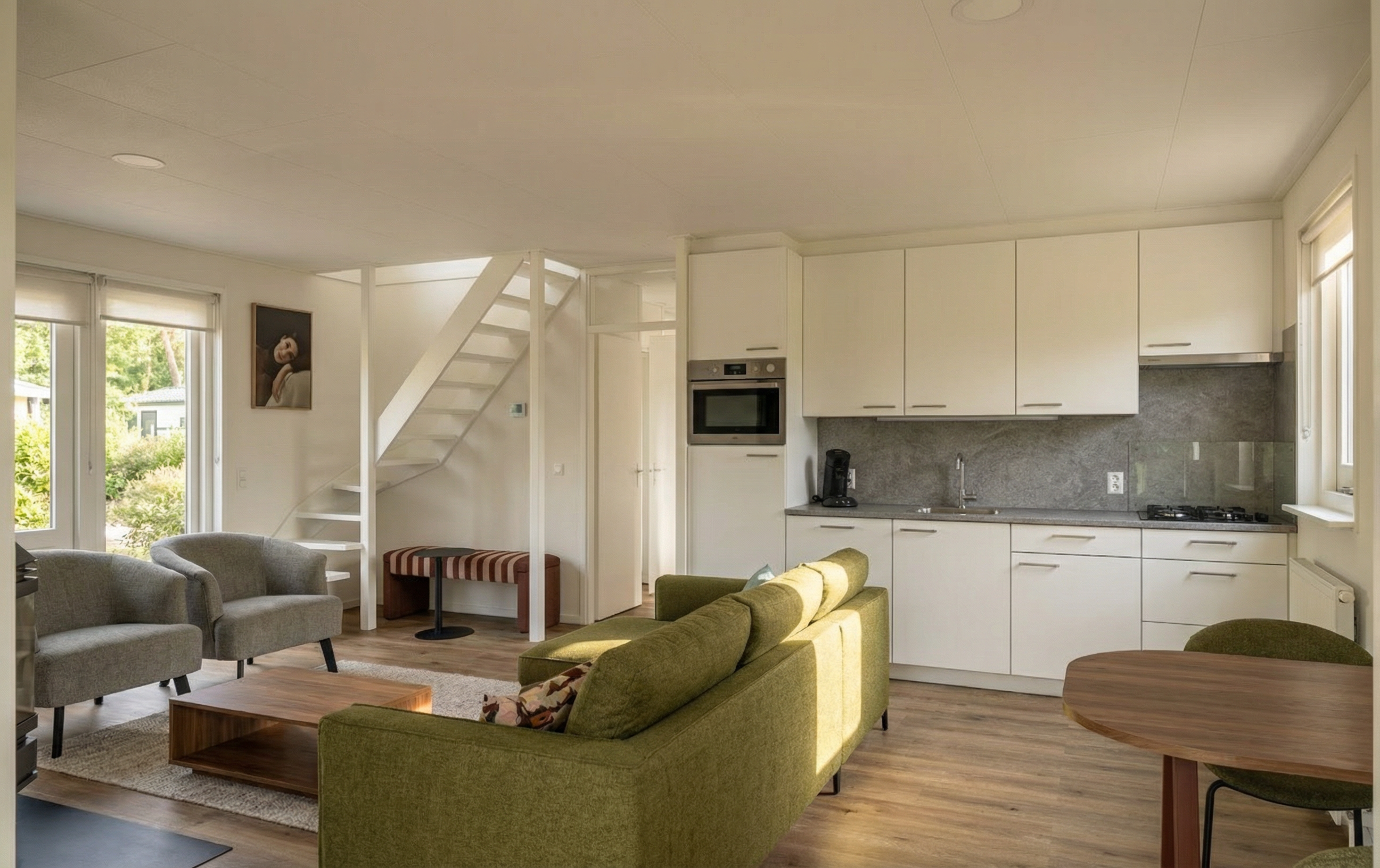 convert this floor plan into a architectural isometric 3d view of a full house show the space from an elevated angle with furniture walls and details visible render a beautiful modern floor plan of a cozy home interior use warm earthy tones throughout apply soft beige and cream for the walls and flooring giving a welcoming feel highlight the kitchen area with sleek stainless steel and quartz textures using subtle grey and white shades depict the living area with plush deep brown leather furniture incorporate soft lighting for a calm and inviting atmosphere casting gentle shadows to enhance depth include small plants with vibrant green leaves to add a touch of nature and freshness to the scene use the same furniture as shows on the plan do not change the orientation of the floorplan