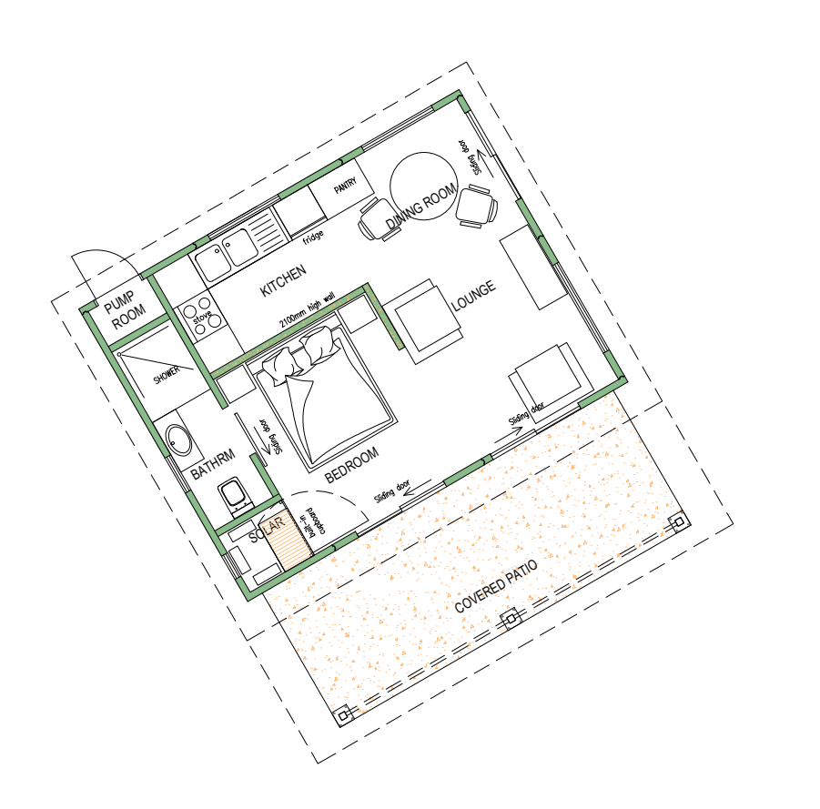convert this floor plan into a realistic isometric 3d view of a full house show the space from an elevated angle with furniture walls and details visible a modern pre cast concrete bushveld lodge with stained concrete floors patio with timber columns and brushed concrete floor use the same furniture as shows on the plan do not change the orientation of the floorplan