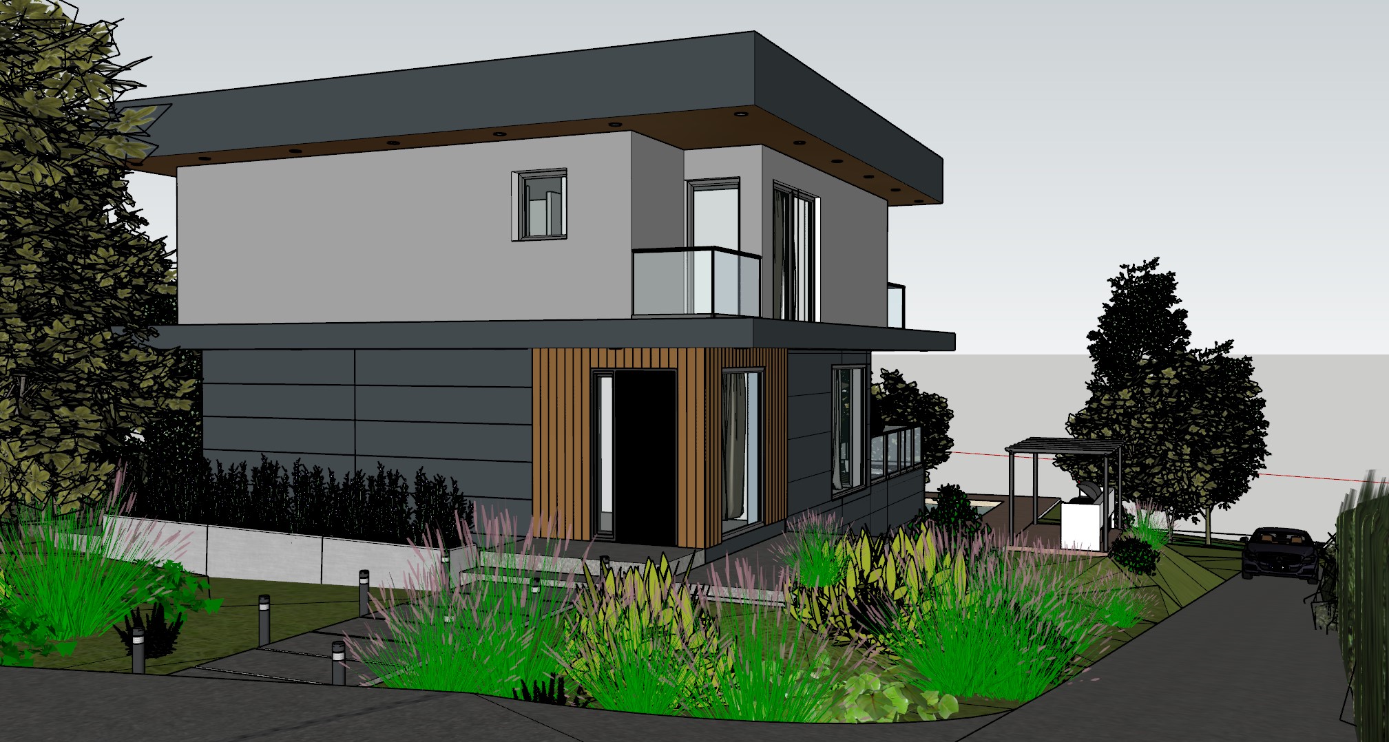 generate a beautifully rendered image of a modern two story house the house features white and dark gray walls with wooden panel accents for a warm touch the roof is sleek and dark gray large windows with transparent glass reflect the serene surroundings the front yard is abundant with lush greenery showcasing various types of grass and decorative plants in vibrant greens and purples the driveway and pathways are smooth gray leading to a car parked gently in the background the atmosphere is calm with soft natural daylight illuminating the scene and subtle shadows adding depth trees in the background are rich in dark green hues enhancing the overall tranquility the hous is looking at another hill and the car is driving down hill to a gate that is at the end of estate