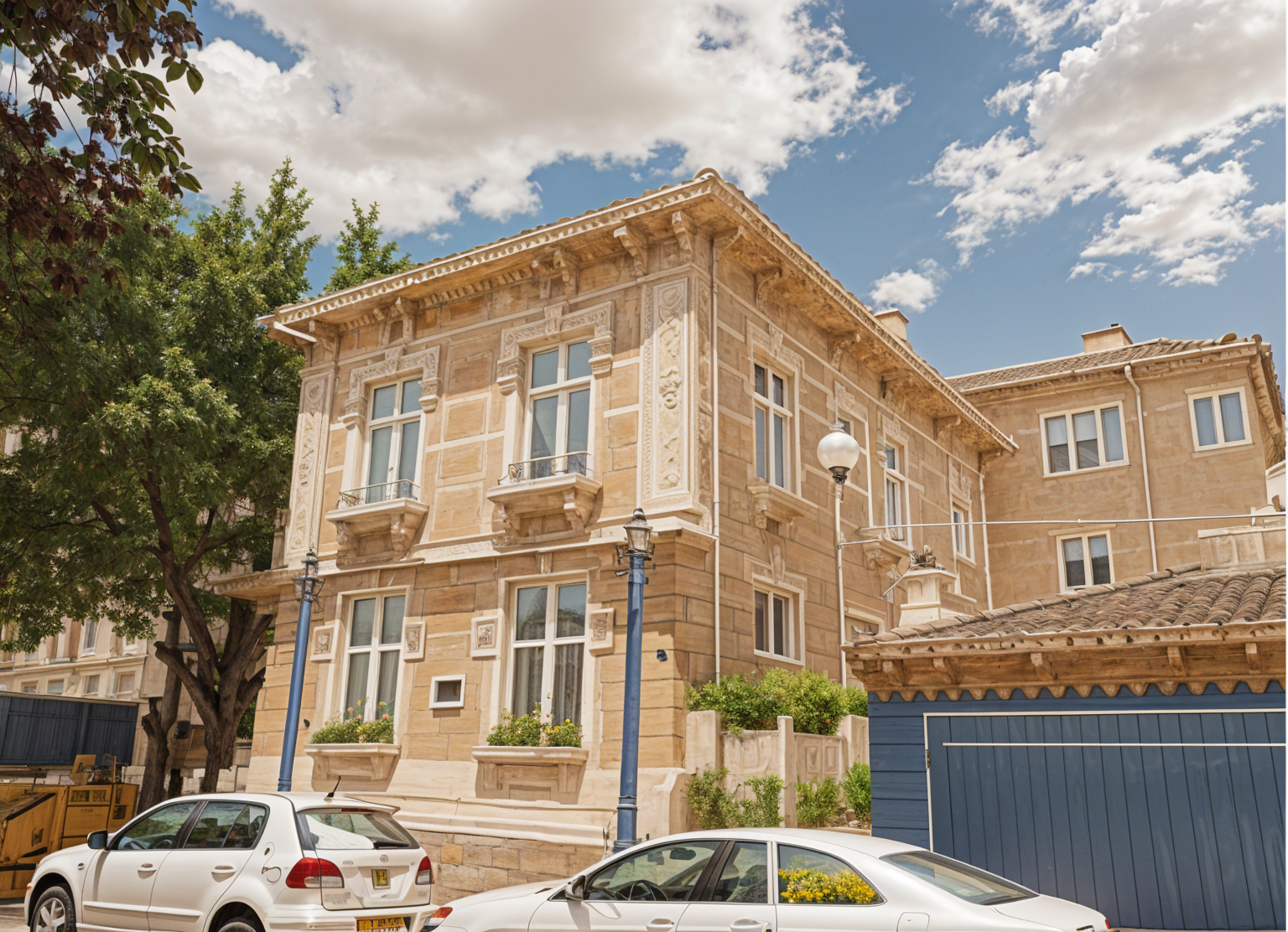 exterior shot render a modern two story house with a gabled roof roof tiles in terracotta red exterior walls in a soft brown color front door in a deep walnut brown with a sleek design windows framed in matte black with reflective glass garage door in walnut brown with subtle panel detailing atmosphere should be bright and sunny with a clear blue sky add lush green landscaping around the house for a vibrant and inviting feel