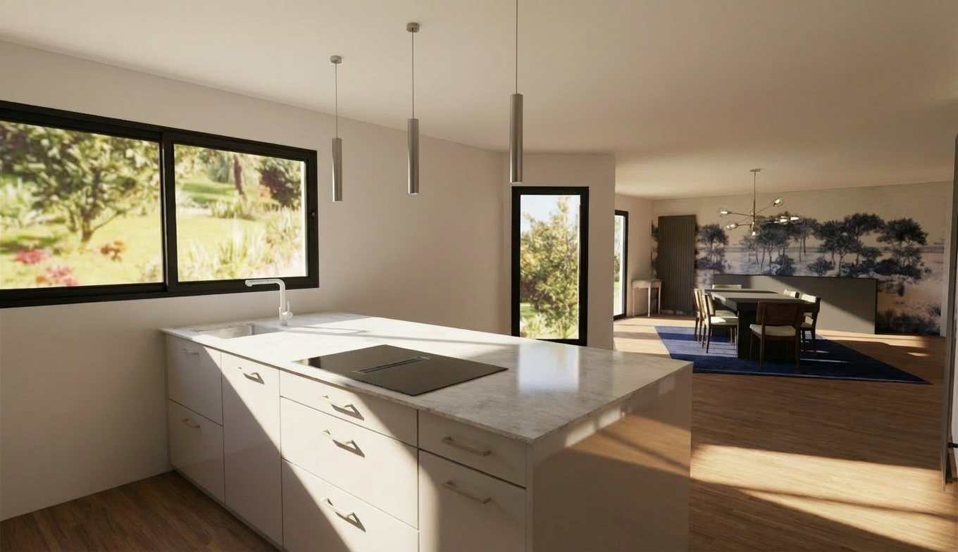 convert this floor plan into a realistic isometric 3d view of a full house show the space from an elevated angle with furniture walls and details visible create a high end apartment worthy of haussmannian architecture in a contemporary style the kitchen will be matte black the floor solid wood parquet and the terrace furnished with garden furniture the bathrooms will be in a minimalist contemporary style use the same furniture as shows on the plan do not change the orientation of the floorplan