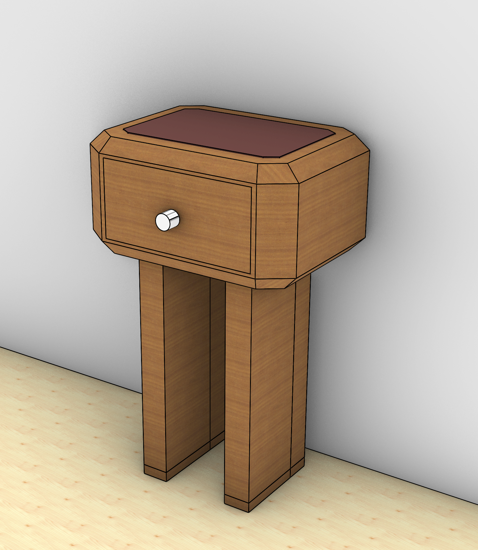 this is a table in cherry wood it has 1 drawer with a metal knob the top has a red leather inlay there is a wood floor in lighter oak the wall is white make it photo realistic crisp lighting
