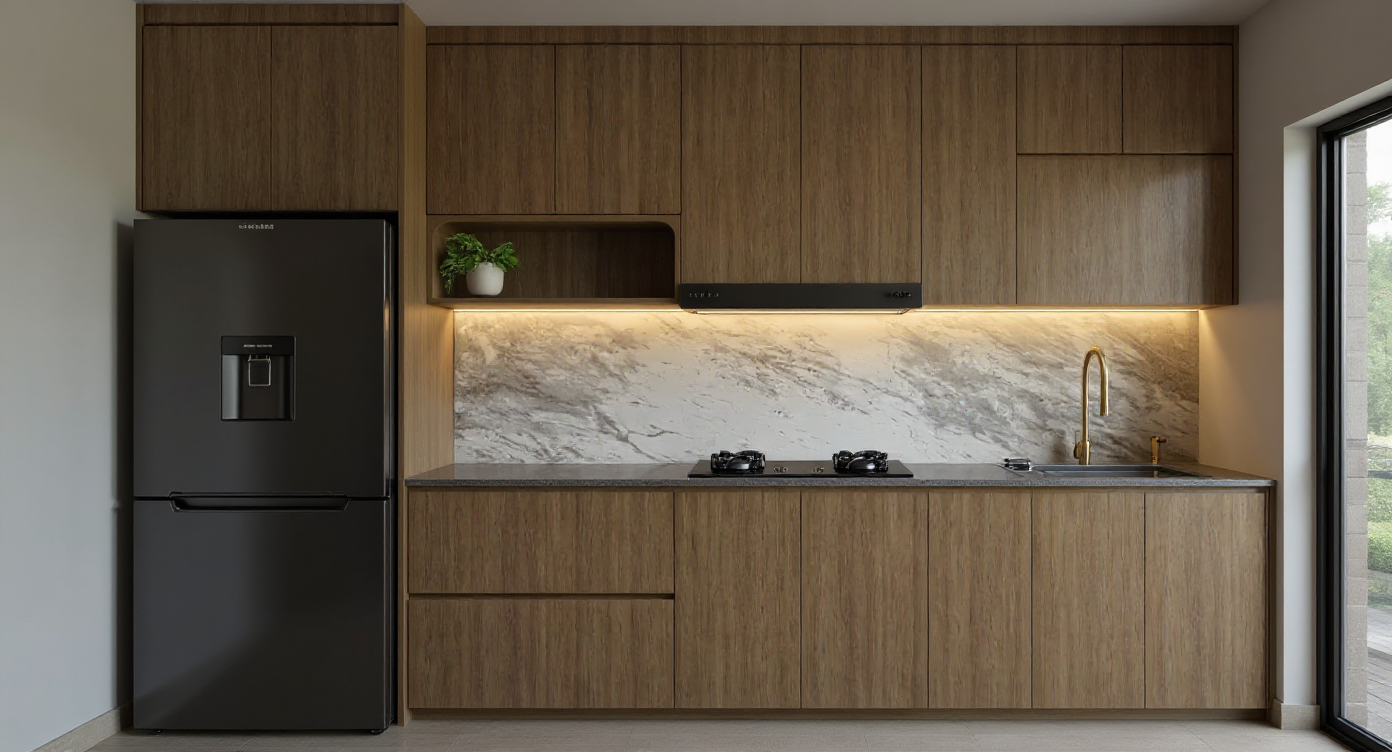 keep all design unchanged make the entire scene bright and luminous with strong natural daylight flooding the space ensure all interior lighting including ceiling downlights and cove lights remain turned on and softly glowing natural daylight and artificial lighting should illuminate the space together for a balanced inviting atmosphere maintain high exposure warm tone and soft realistic shadows sunlight coming from the right side evenly lit elegant high end mood