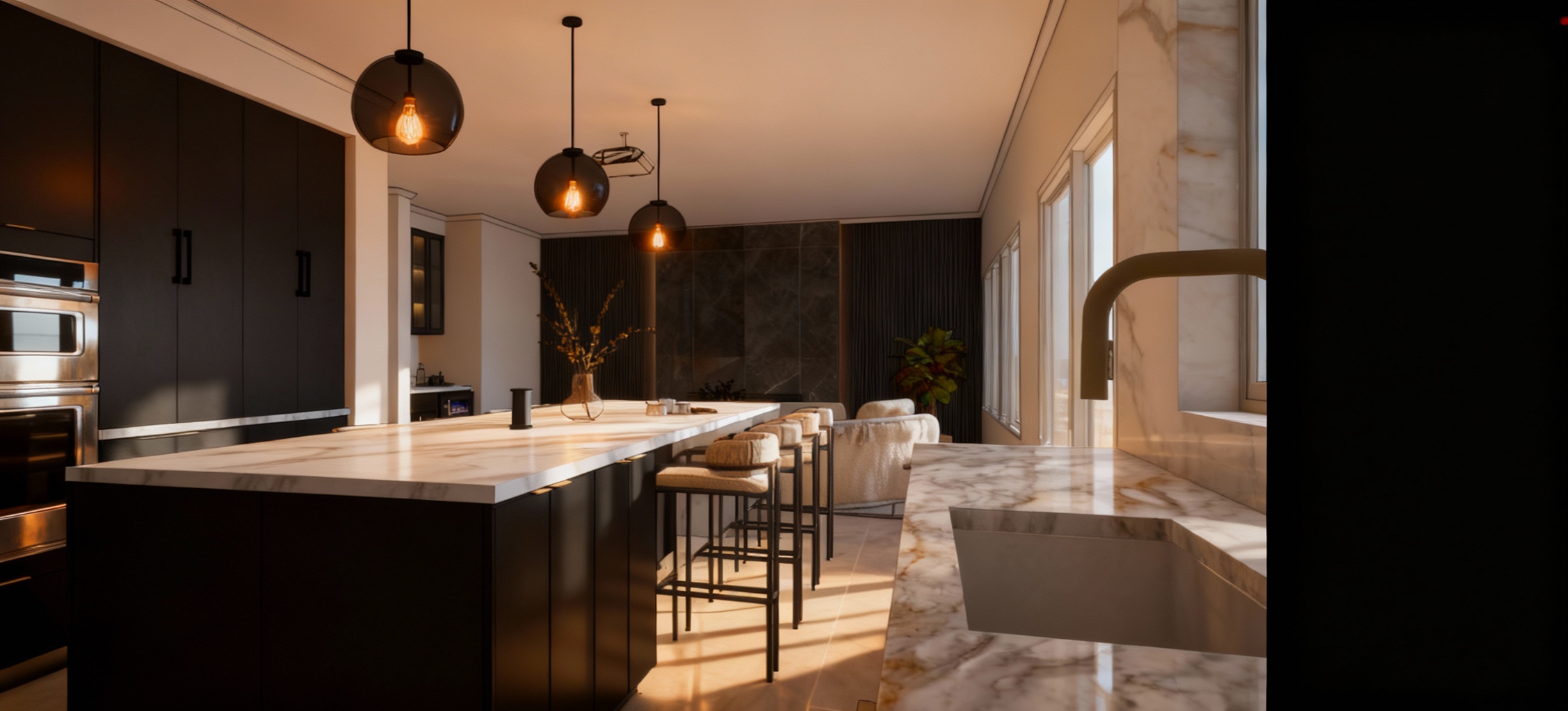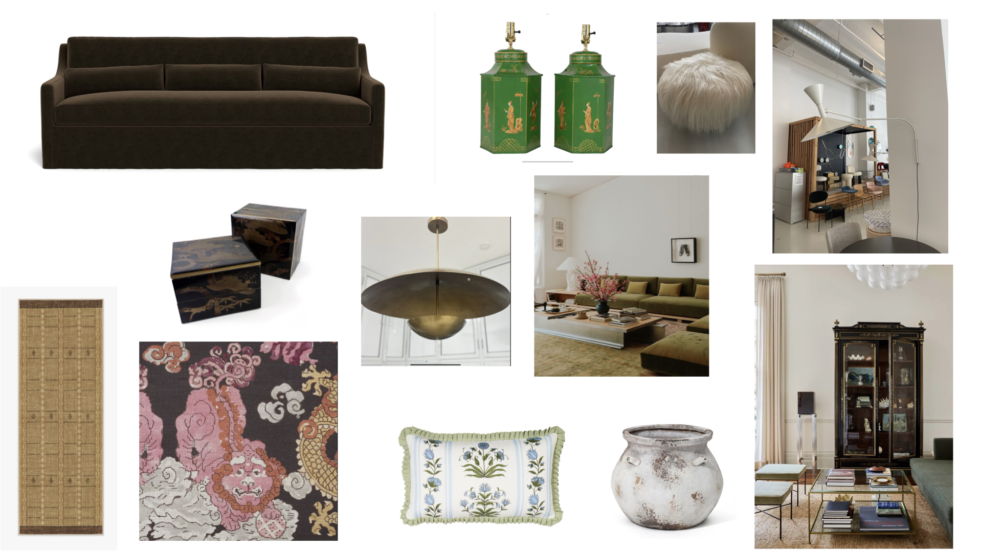 10 x 12 room with a floor to celing window on the left side of the composition walls should be painted in a white roman clay with a creamy yellow undertone celing lights should be mud in recessed track lights dark walnut textured wood floor with a large knitted sage green rug fireplace wall should be the full length of the space eight a drywall ledge above with a hidden tv add tow chairs on the other side of the coffee table make end tables a modern stump table