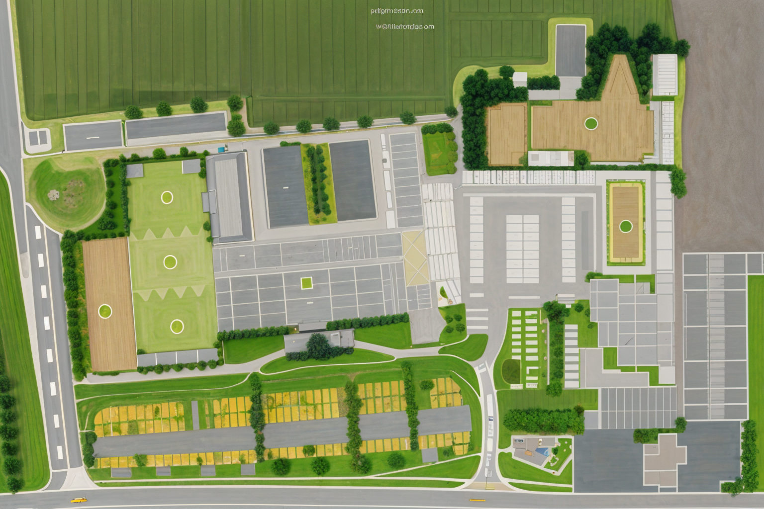 rooftop shot create a detailed and vibrant architectural rendering of a hotel and leisure club layout use warm golden yellows for the building structures lush green hues for the grass areas and trees and a bright sky blue for the pond and water features include realistic textures for pathways and parking areas in deep gray add shadows for depth and an inviting tranquil atmosphere with soft lighting to highlight the landscaping architecture