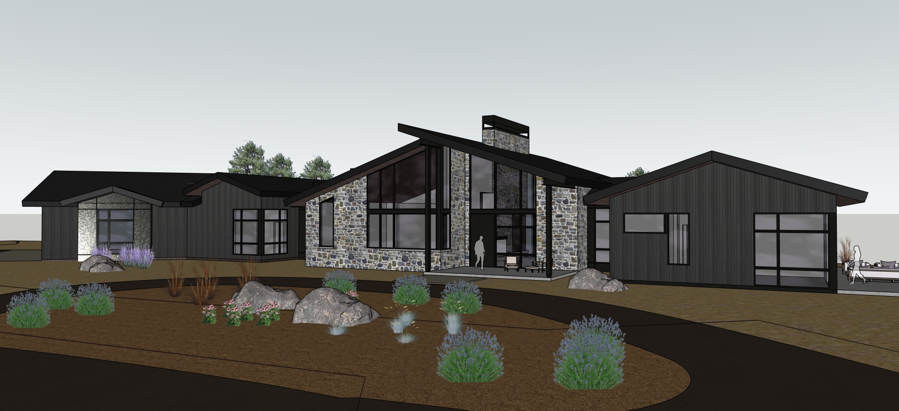 the rendering is a modern home on a sunny colorado afternoon the background is a distant ridge with indecipherable vegetation the home features a stone veneer with a mixture of grey hues and an overgrout application the stones are squares and rectangles the wood siding is 8 wide in a vertical format and is a dark grey stain the roof is standing seam metal in a matte black with black trim and grey tongue and groove soffits the ground directly around the house should be small pebbles with scattered landscaping