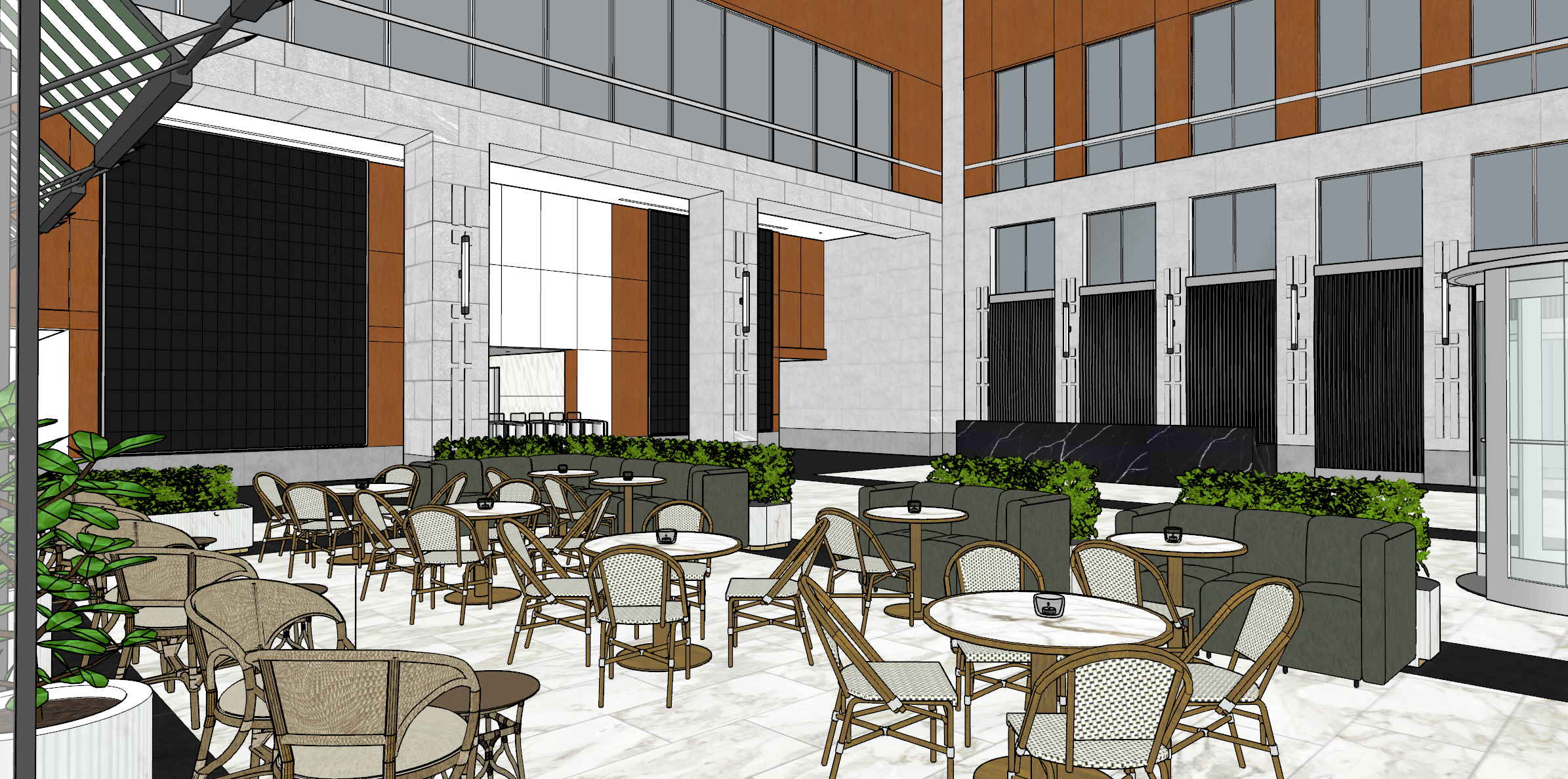 turn image to a realistic photo of luxurious lobby cafe seating add a lot of professional people day time setting illuminate all spaces make the 2 left large black screens into a digital led screen showing data