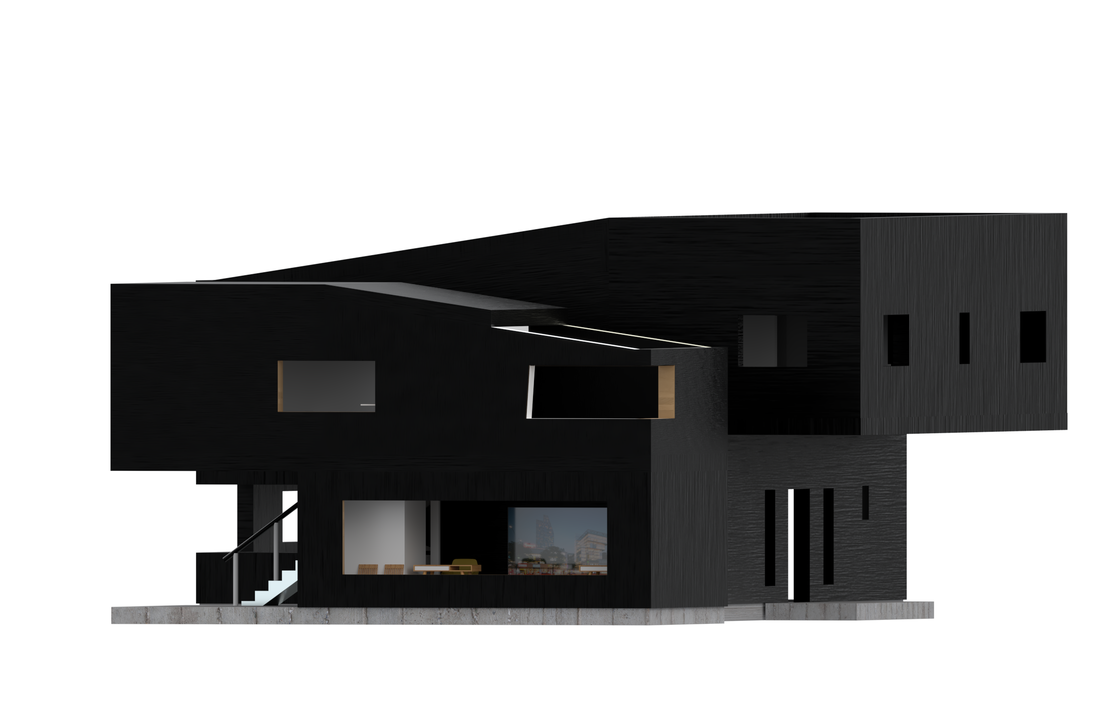 try again and correct the angle of the roof on the backhouse exterior shot apply soft daylight with slight haze desaturated earthy tones and a cinematic mood emphasize minimalist composition muted colors and flat entourage silhouettes that blend graphically into the scene reduce hyper real reflections and glossiness adding subtle film grain for a photographic feel final image should feel like a conceptual architectural visualization calm atmospheric and editorial