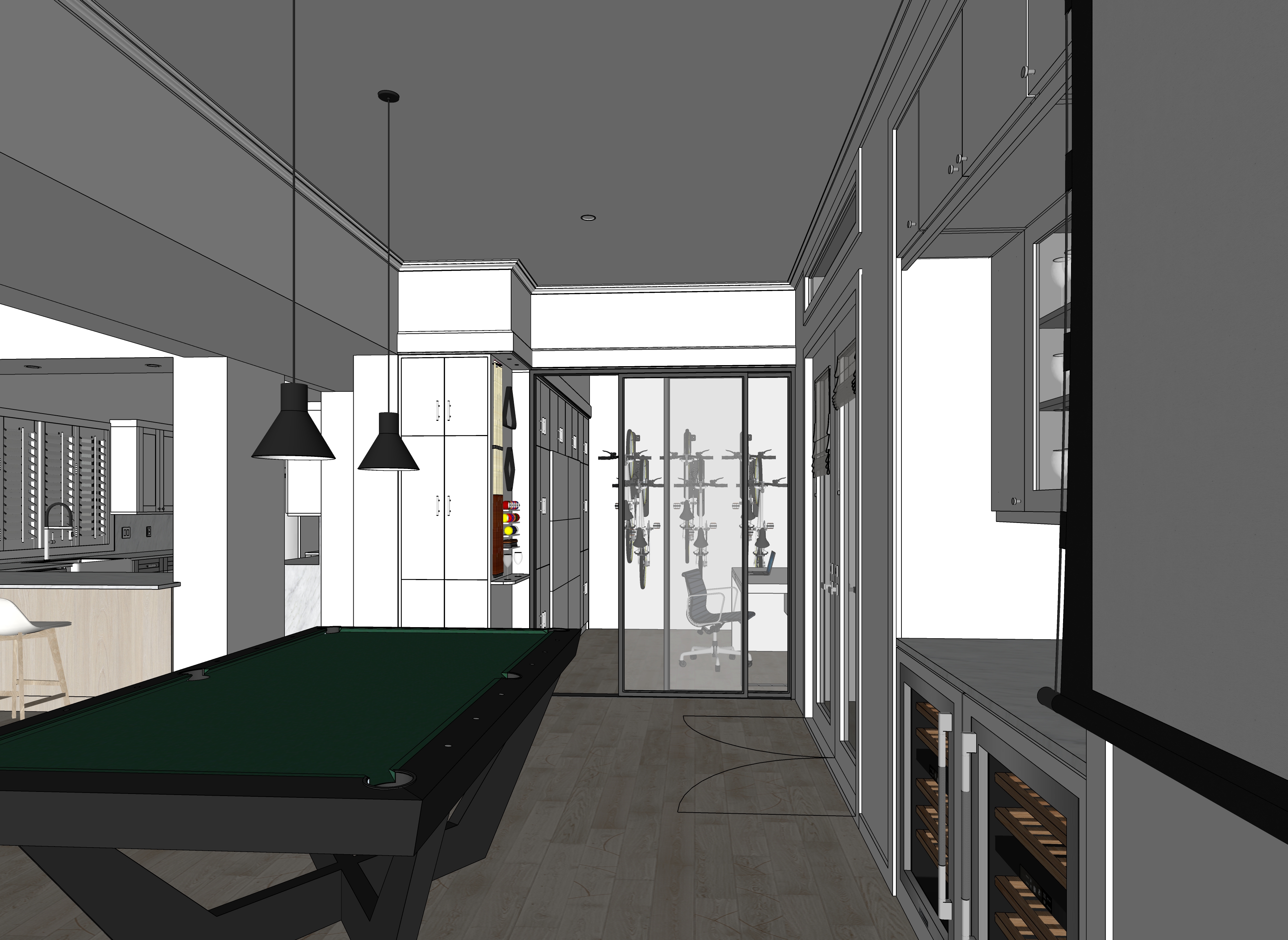 night lighting in the space add lighting on the white marble countertops keep the cabinets white like the source image the walls are painted white show a music video from kendrick lamar on the screen at the right side of the view keep the light effect over the pool table add light effect where there are recessed lights add a man sitting at the desk working at the laptop do not add any recessed lights to the view all cabinets doors are slab design not shaker don t add any pendant lights over the desk make the light color temperature warmer keep the ceiling white