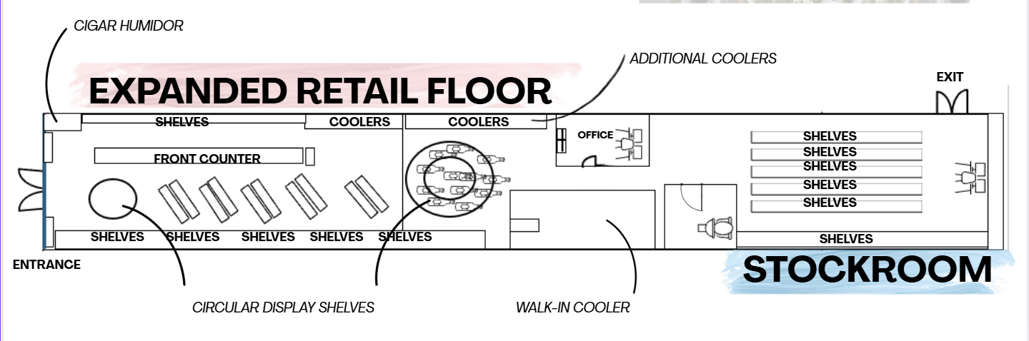 convert this floor plan into a realistic isometric 3d view of a full house show the space from an elevated angle with furniture walls and details visible liquor store use the same furniture as shows on the plan do not change the orientation of the floorplan