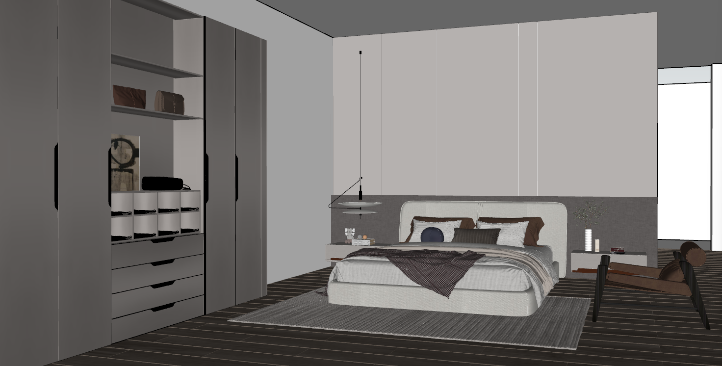 a modern and minimalist bedroom interior render an elegant space designed in gray and beige tones featuring a centrally placed double bed with soft rounded forms and light colored fabric upholstery layered pillows in white brown and gray complemented by a natural textured bed throw behind the bed a half height dark gray textured wall panel with a smooth light colored surface above it on the left side a built in wardrobe system with open shelves drawers and neatly arranged accessories on the right side a minimal bedside table and a modern black slim pendant light dark wooden flooring with a light gray area rug placed under the bed soft natural daylight with window light coming from the right side photorealistic high detail global illumination soft shadows ultra realistic interior 4k resolution cinematic composition clean modern design architectural visualization