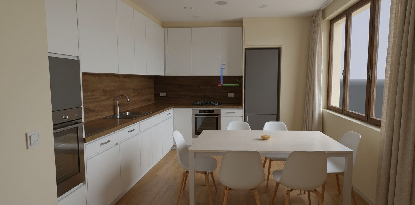 make a rendering of a modern kitchen with white cabinets a wooden countertop and backsplash a stove and sink on the countertop and beige curtains in front of the windows the walls in light beige marble tiles on the floor