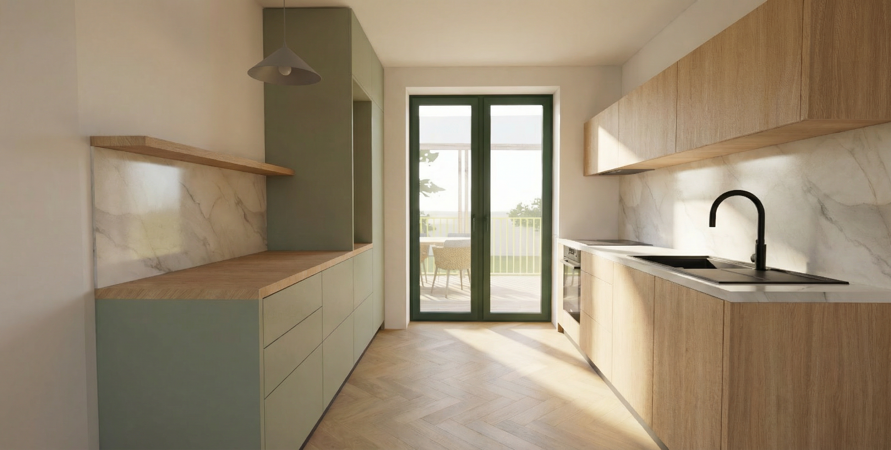 make it a charming rustic kitchen with oak wooden cabinets an white marble countertops and black accent i would also like black handles on all the cabinets