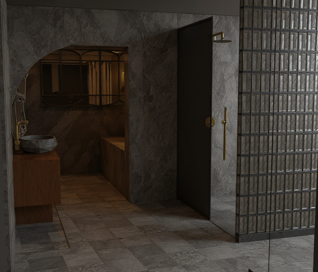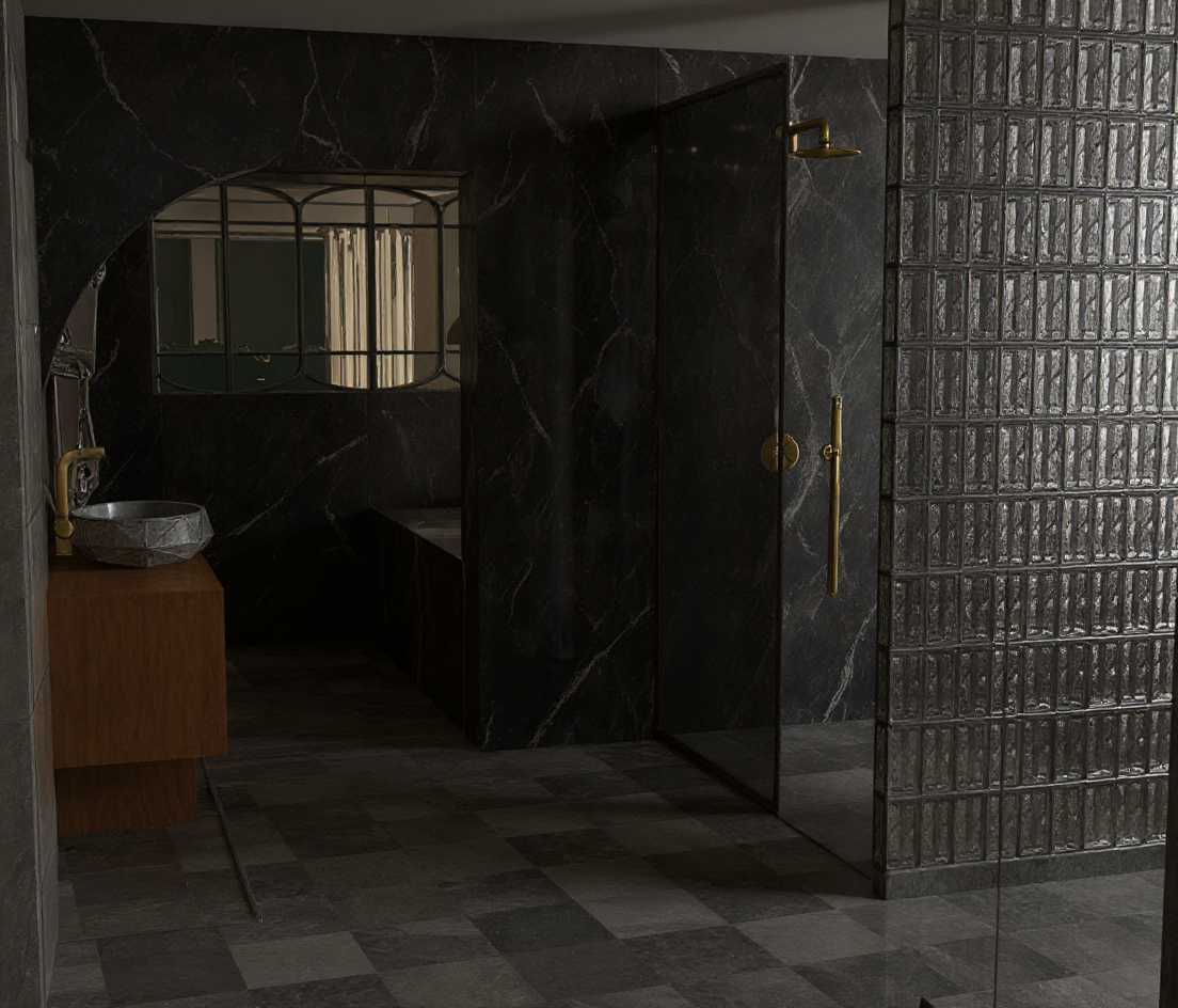 marbre noir veines dor es dorure pav de verre gris meuble en bois vasque en pierre plafond spots robinet dor romantique
