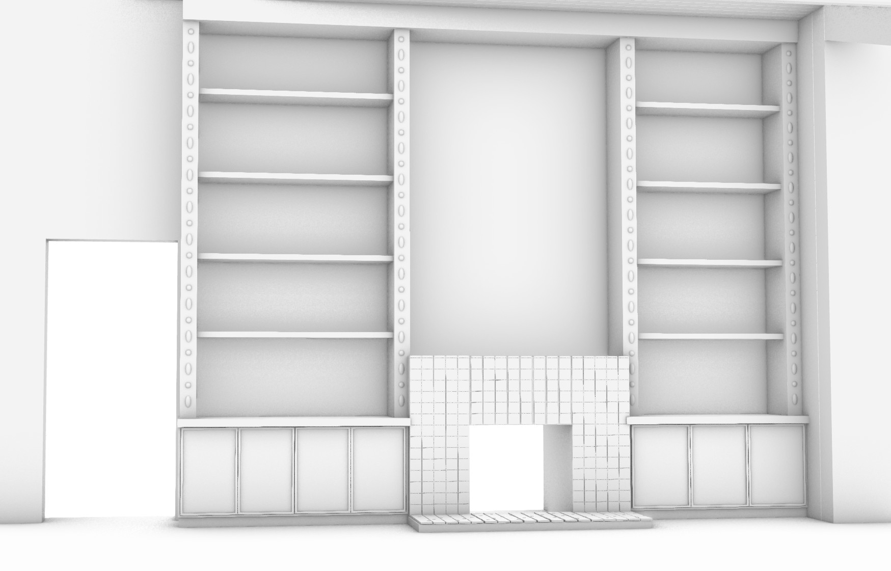 render the shelves in alder wood use a light brown tile on fire place architecture