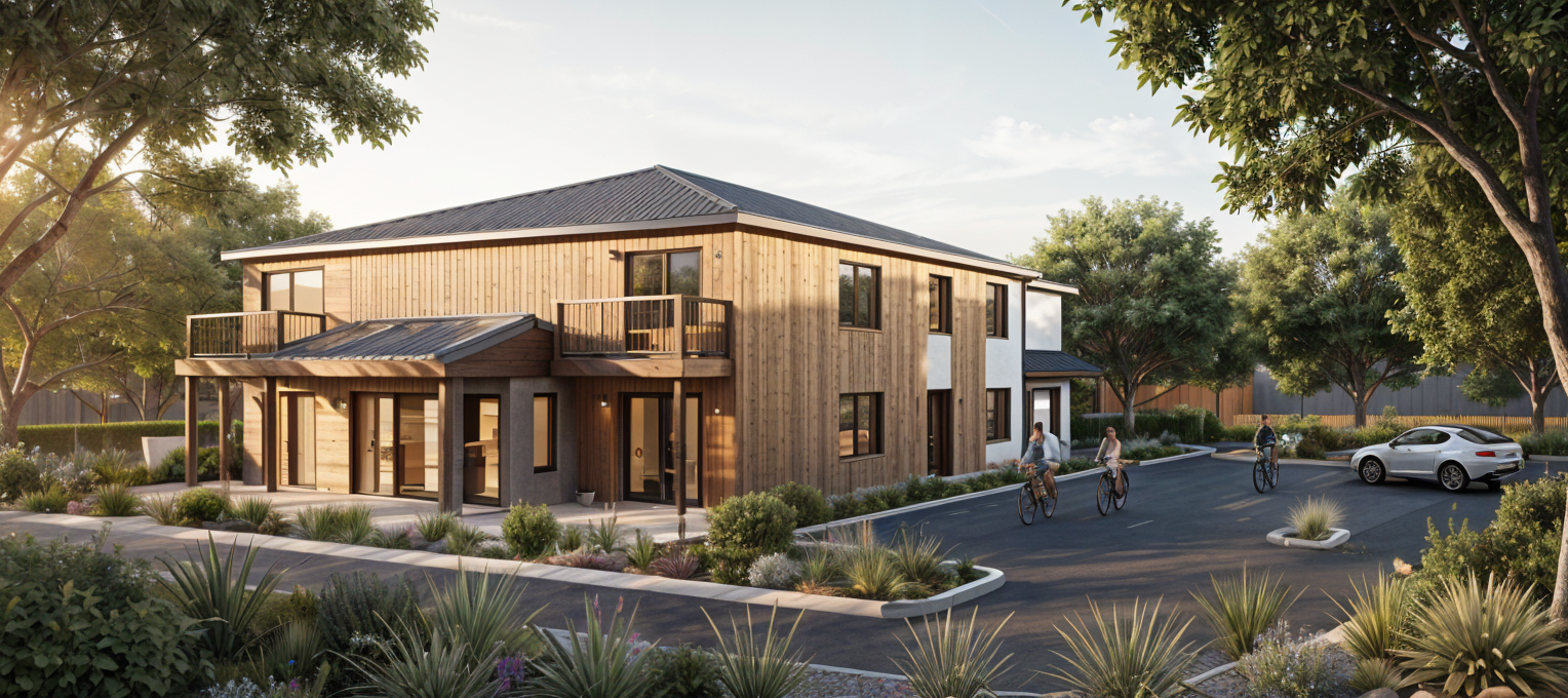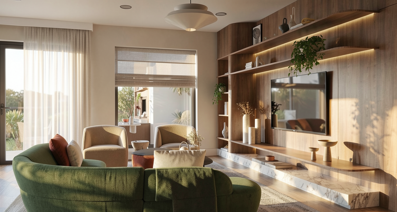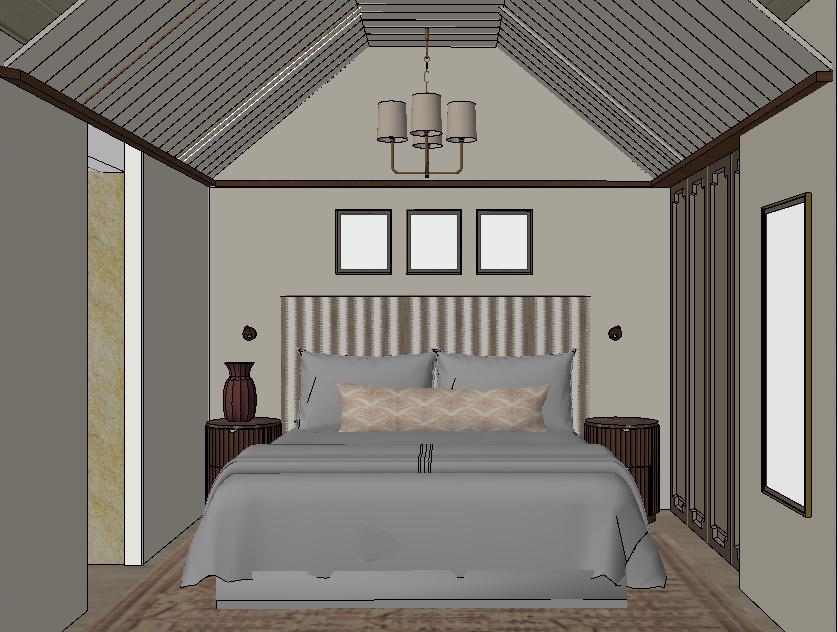 render a cozy and elegant bedroom with a vaulted ceiling use soft beige for the walls the vaulted ceiling has painted slats for a warm atmosphere include dark wood nightstands on either side each with a deep burgundy vase frame the ceiling light with a brass fixture and cream colored shades add simple botanical prints in the frames above the headboard the floor is a light oak wood and there s a faintly patterned beige rug under the bed the atmosphere should be serene and inviting using warm and neutral tones throughout
