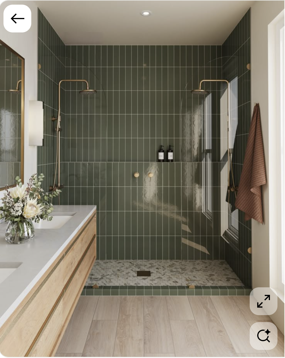 render this image with a dark slate gray with a hint of blue tile instead of green a darker walnut vanity and concrete look tiled floors