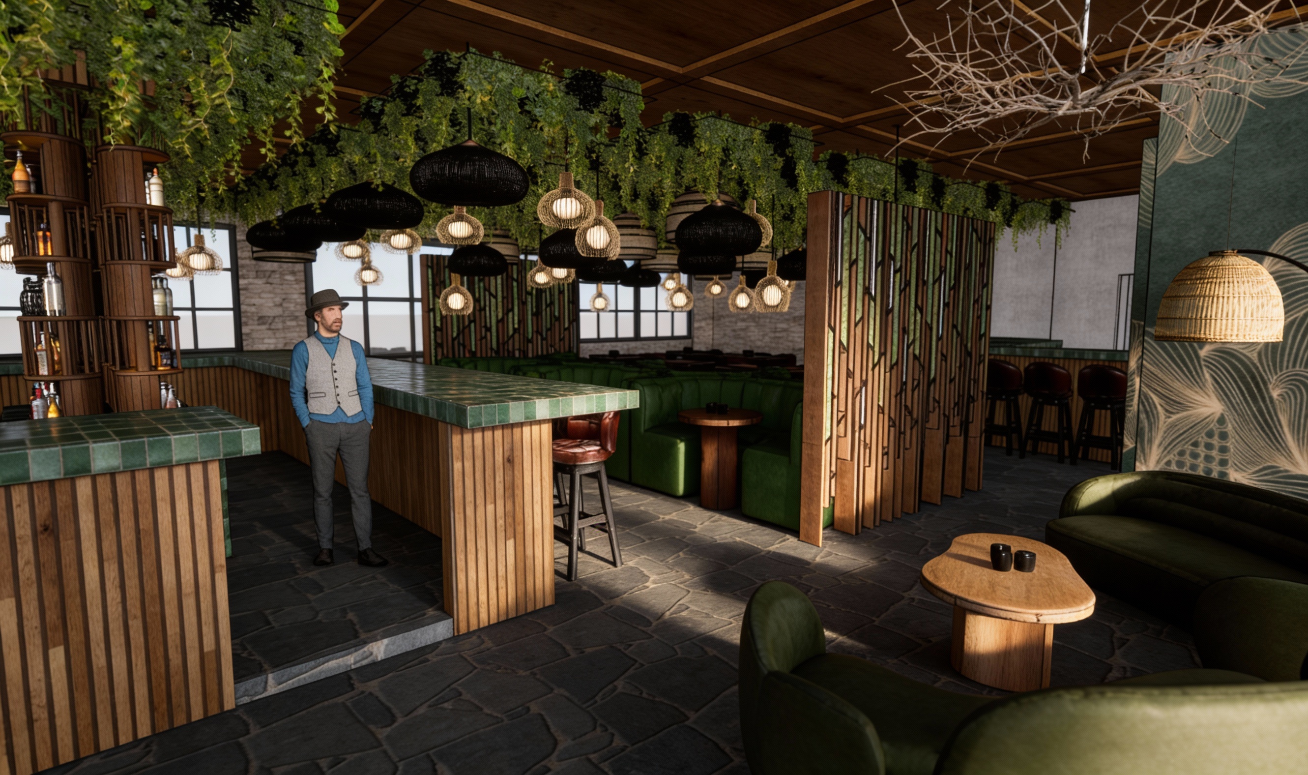 add a tropical scene in the exterior add neutral colored pillows add people sitting add 2 large vases on each table correct the lighting to look better make the chairs brown and add a jute rug put a light wood tone picture frame around the art and add decorative bowl to the second coffee table remove the white chairs