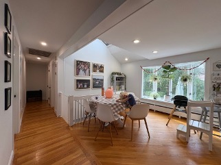 dining room refresh change trim and window color to halcyon green and hallway to striped golden wallpaper change table to trestle dining table with article rus oslo blue chairs