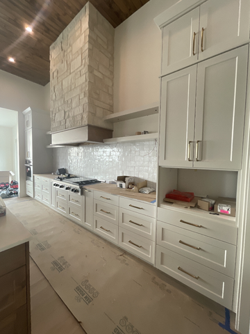 do not change the cabinets in any way preserve the exact cabinet colors materials finishes dimensions door and drawer styles hardware spacing alignment and all geometry exactly as shown do not alter the countertop shape backsplash appliances flooring lighting fixtures or wall structure only remove the construction materials clutter and mess from the scene clean the room and make it look finished and staged add a few simple tasteful home accessories appropriate for the style of the space but do not add or remove any furniture windows or architectural elements maintain the original lighting direction and realism enhance clarity and polish the photo while keeping the cabinetry and room design completely unchanged do not alter the lighting to keep the cabinet colors as they are in the image add new flooring and countertop add a bosch electric speed oven in the opening of the full height cabinet that fits the entire opening stage the floating shelves and countertop for a beautiful luxury country kitchen
