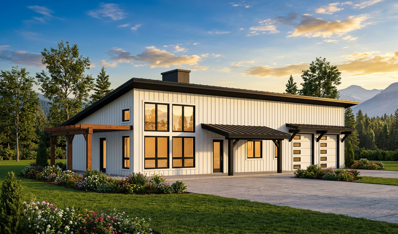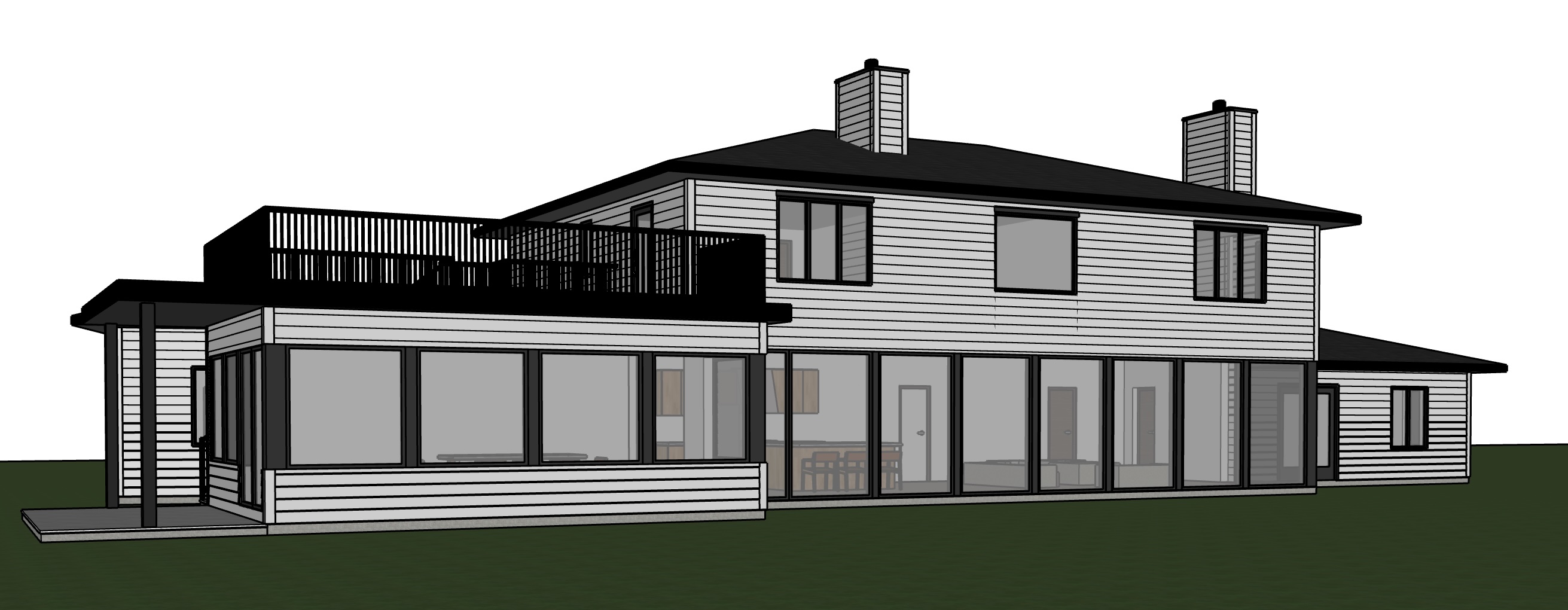 watercolour rendering no changes to architecture in image provided white siding for exterior roof are black add some subtle landscaping local to qc forest in background railing in model is black iron rods do not add in any additional railings not already in the model do not add any pathways this is the rear side of the house show grassy yard make windows and glass doors opaque so we don t see inside of house make it so they are not see through make landscape more rocky with gravel