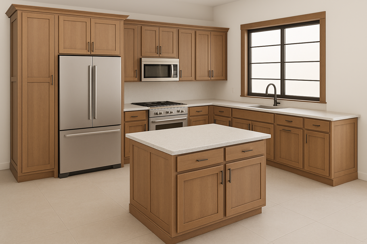 interior shot please reverse the island so the doors and drawers are on the other side please change cabinet colors to a mix of white and deep grey
