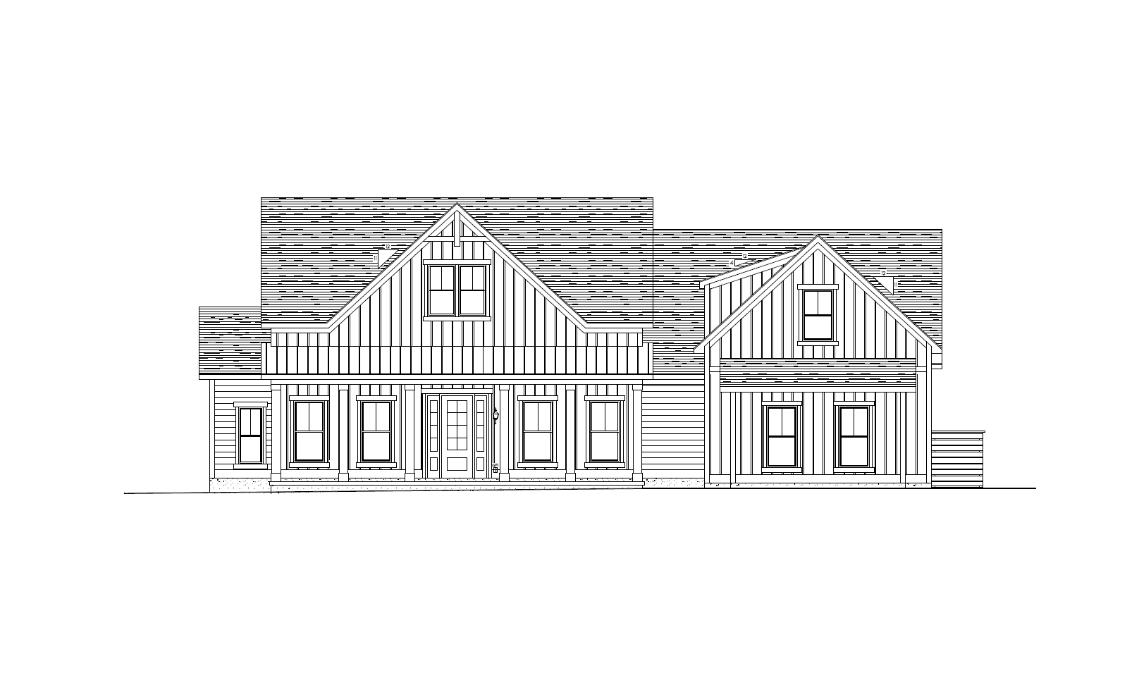 make this front elevation photorealistic while keeping textures and architectural elements the same as selection add professional landscaping on a lightly wooded scene with good lighting that is in beaufort sc use the following colors and materials board and batten siding to be contented bcc1b4 in color lap siding to be contented bcc1b4 in color corner boards to be white edece6 in color shingle roofs are to be certainteed dimensional shingles in moire black standing seam metal porch roof to be matte black in color windows to be white in color window trim to be white edece6 in color fascia soffit gutter and downspouts to be white edece6 in color frieze boards are to be white edece6 in color exterior lights to be progress lighting east haven exterior lights black in color foundation to be poured wall tabby concrete entry door to be stained dark walnut a medium to dark brown with a rich warm tone entry door sidelites to be stained dark walnut a medium to dark brown with a rich warm tone entry door trim to be white edece6 in color horizontal slat privacy fence at right side of home to be stained dark walnut a medium to dark brown with a rich warm tone porch columns to be white edece6 in color