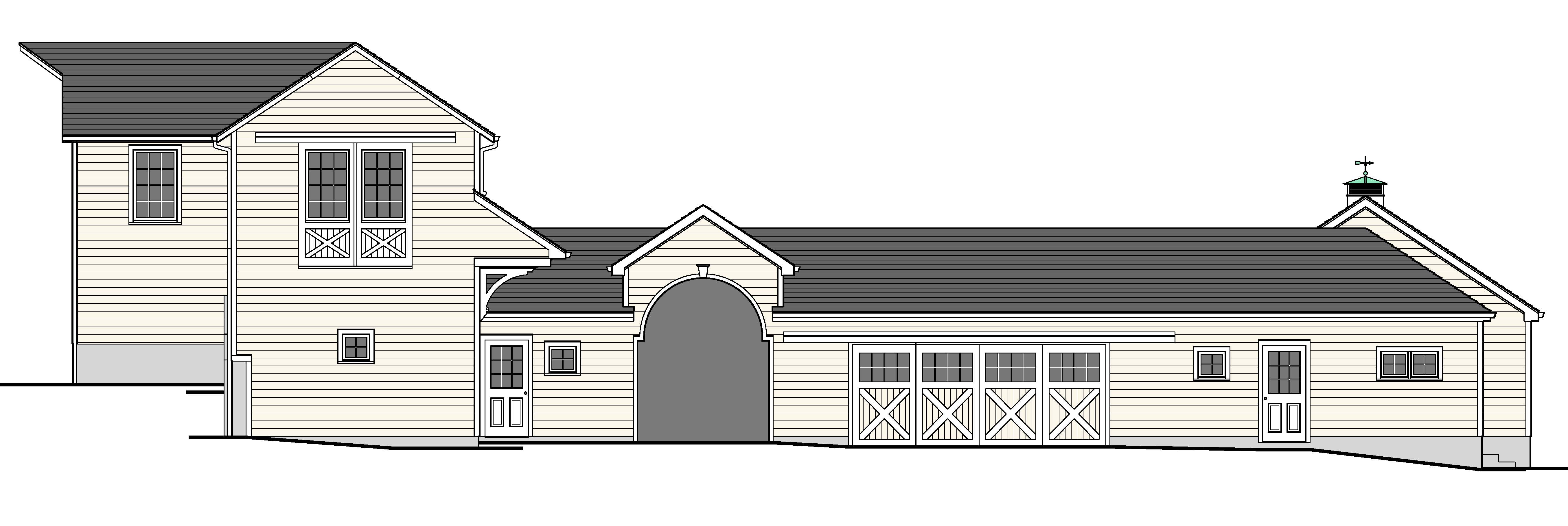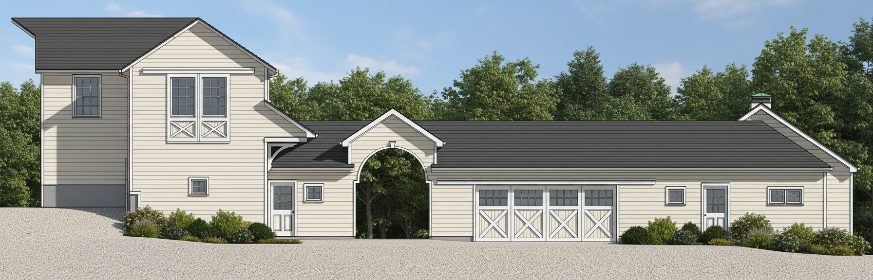 gravel ground grey stucco foundation grey shingle roof white trim blue sky trees in the background see clear through arch no trees elevation detail to be max 100 no bushes